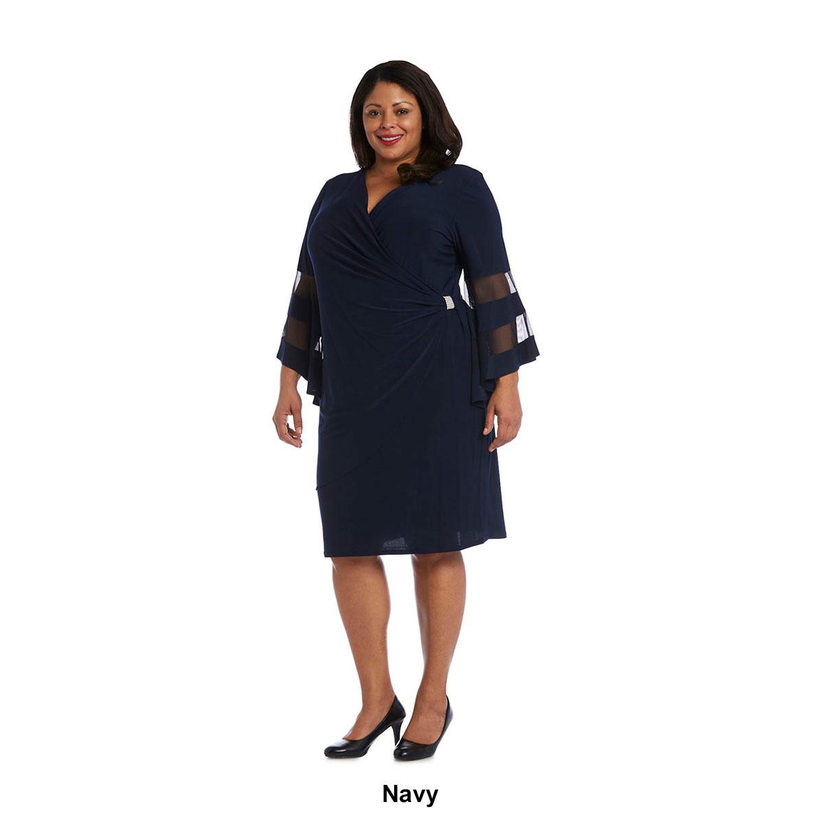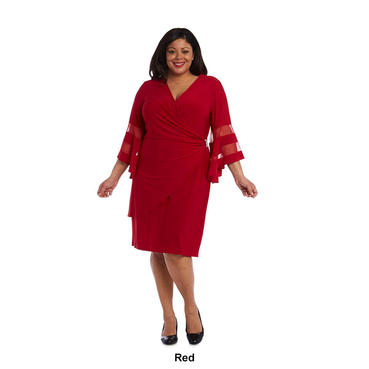 Description This Plus Size R&M Richards bell sleeves wraparound knee-length dress is perfect for a night out. Features a v-neck with a beautiful jeweled piece to complete the...