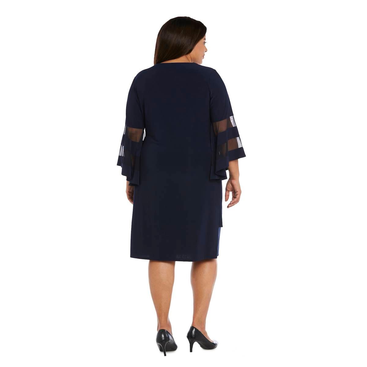 This Plus Size R&M Richards bell sleeves wraparound knee-length dress is perfect for a night out. Features a v-neck with a beautiful jeweled piece to complete the wrap. The sleeves flare from above the elbow into a bell-style shape with sheer mesh inserts.