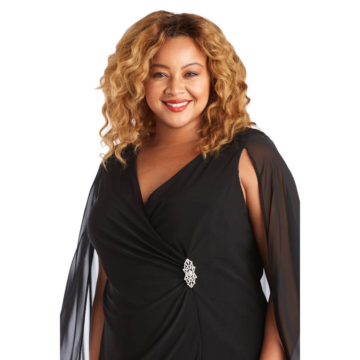 This Plus Size R&M Richards chiffon duster cape wrap dress is the perfect addition to your wardrobe. The cape gives an elegant and fancy vibe that will wow everyone.