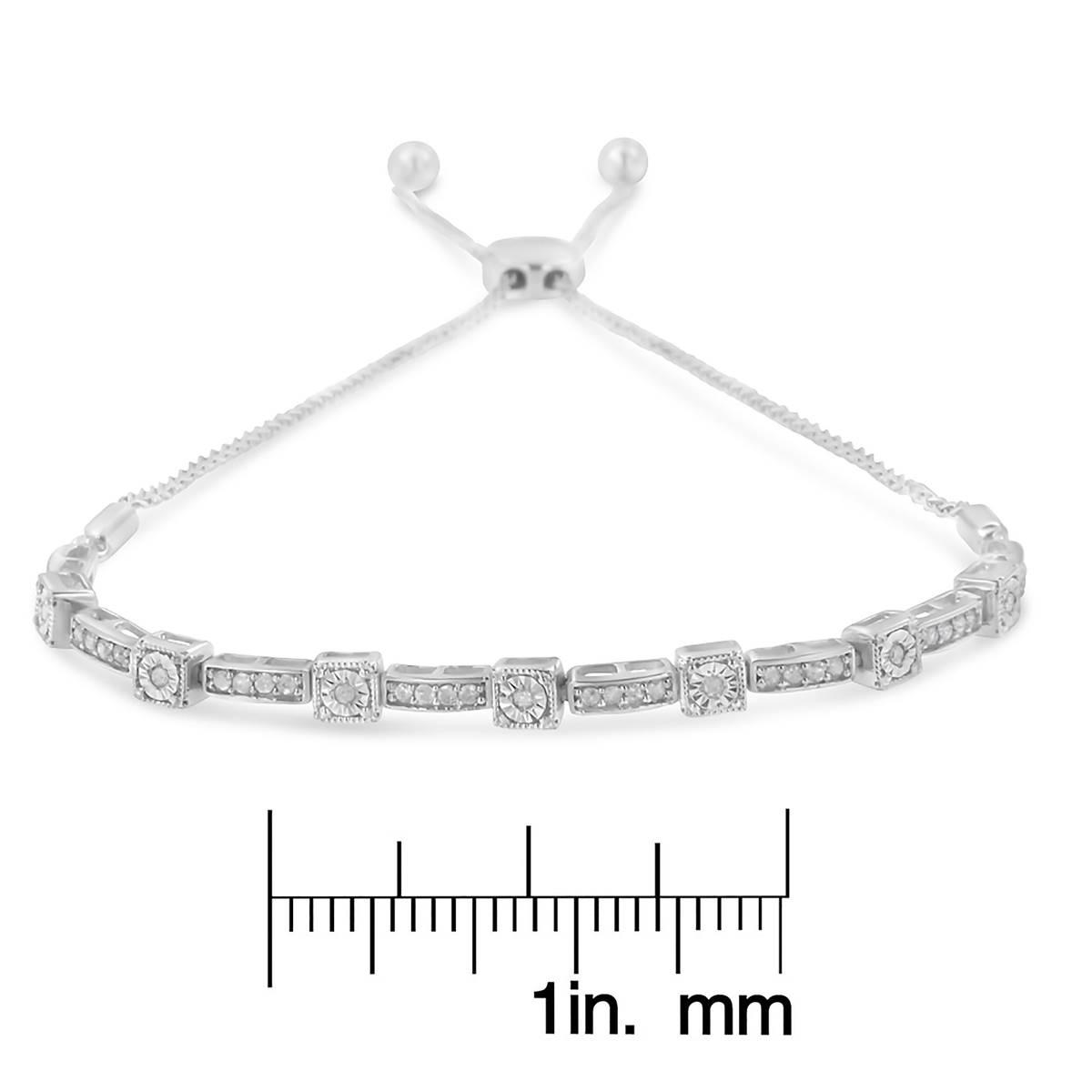 Express your affection to her with this Haus of Brilliance 1/4ctw. diamond adjustable bolo bracelet. Uniquely designed, it is composed of sleek sterling silver, which is finely polished with grace. The bracelet features round, and rectangular accents that are adorned with flickering round cut diamonds. It comes with an adjustable chic wheat chain and bolo clasp that lends a custom fit.