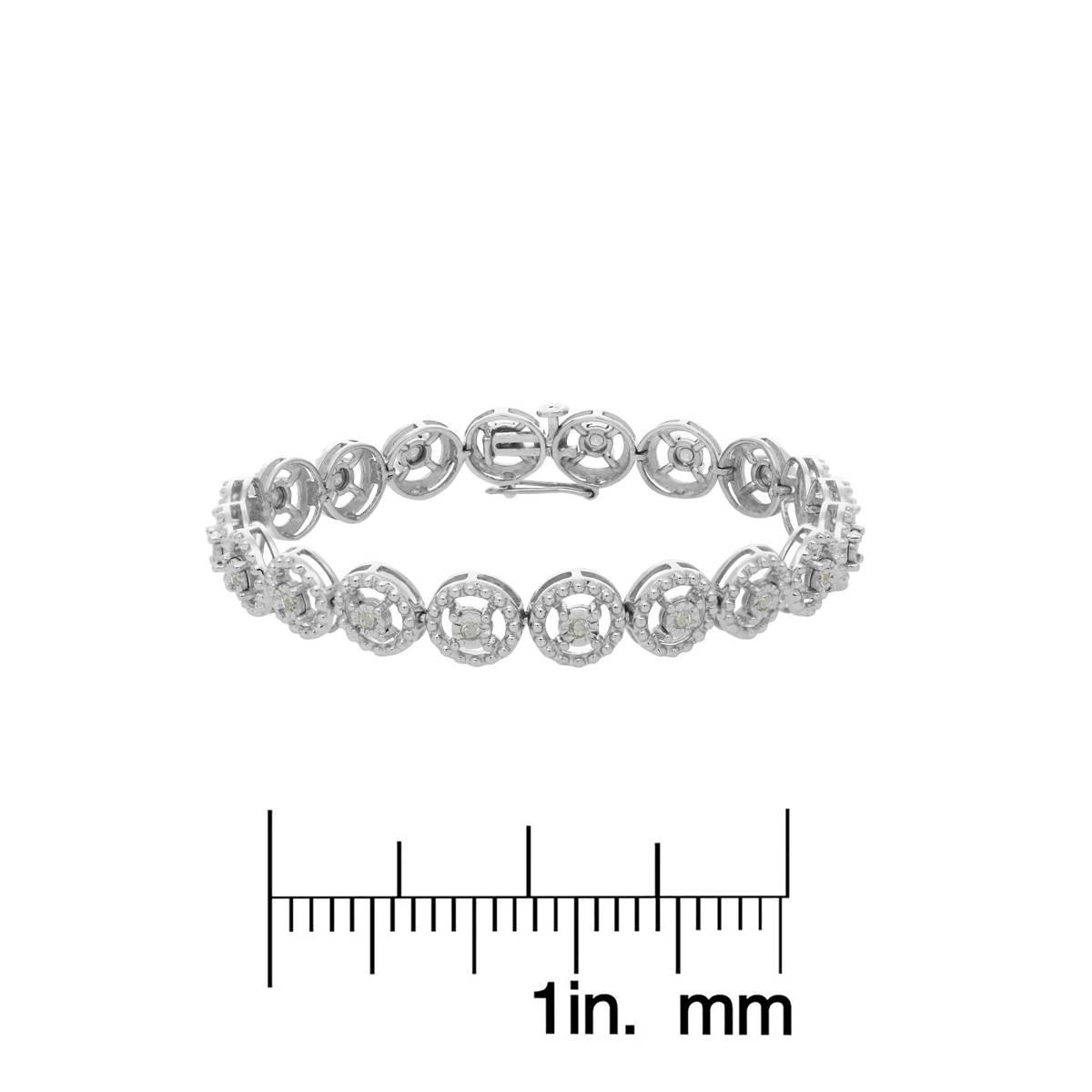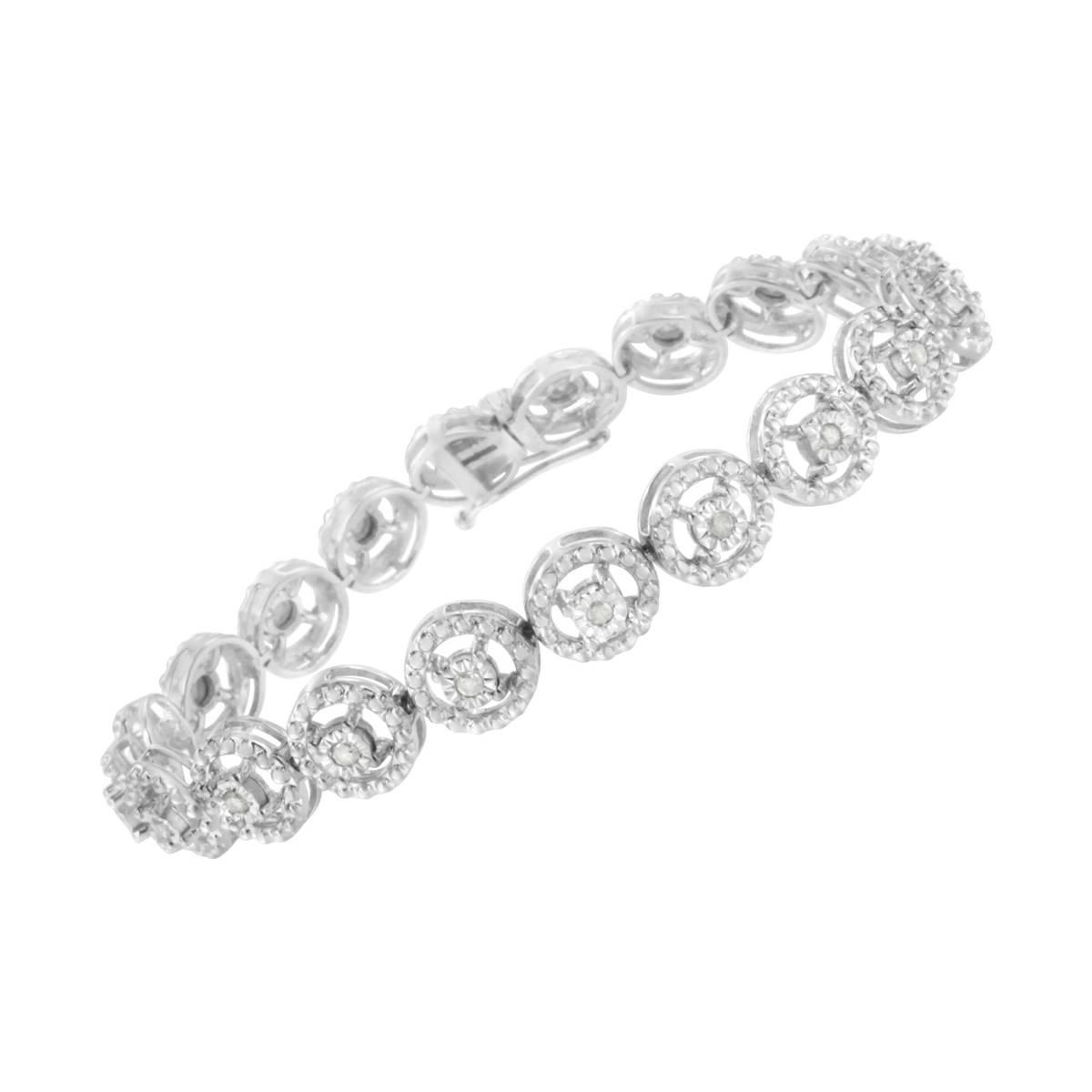 This Haus of Brilliance 1/2ctw. diamond fashion link bracelet is elegant and timeless. Features round, rose-cut diamonds in a miracle plate setting, which centers each genuine diamond in a mirror-finish, high-polish frame, giving the illusion of a much larger stone. These stones are nestled in the center of open wheel-shaped links decorated with studs that mimic the appearance of stones.