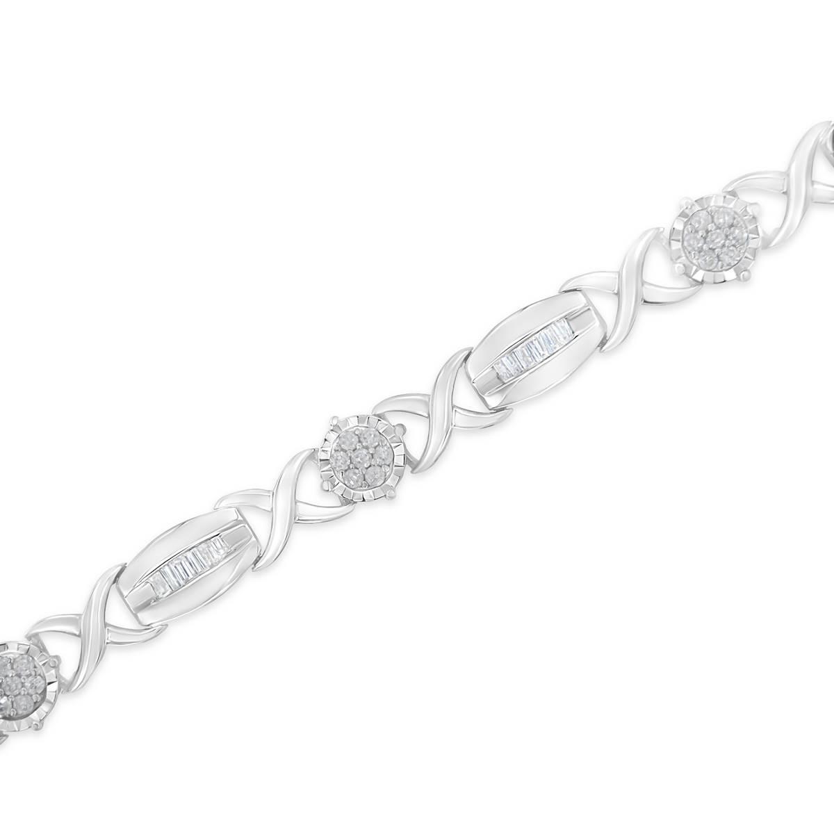 This Haus of Brilliance 1.0ctw. diamond x-link bracelet boasts an incredibly unique design of "x" links alternating between floral and rectangular blocks. This beautiful piece features an array of round-cut and baguette-cut diamonds with a total carat weight of 1.0cttw. This piece is crafted from the finest .925 sterling silver, plated with rhodium (a platinum-family metal) for a lifetime of tarnish-free wear. It comes with a box with a clasp for a secure fit. This is the perfect addition to any serious jewelry collection.