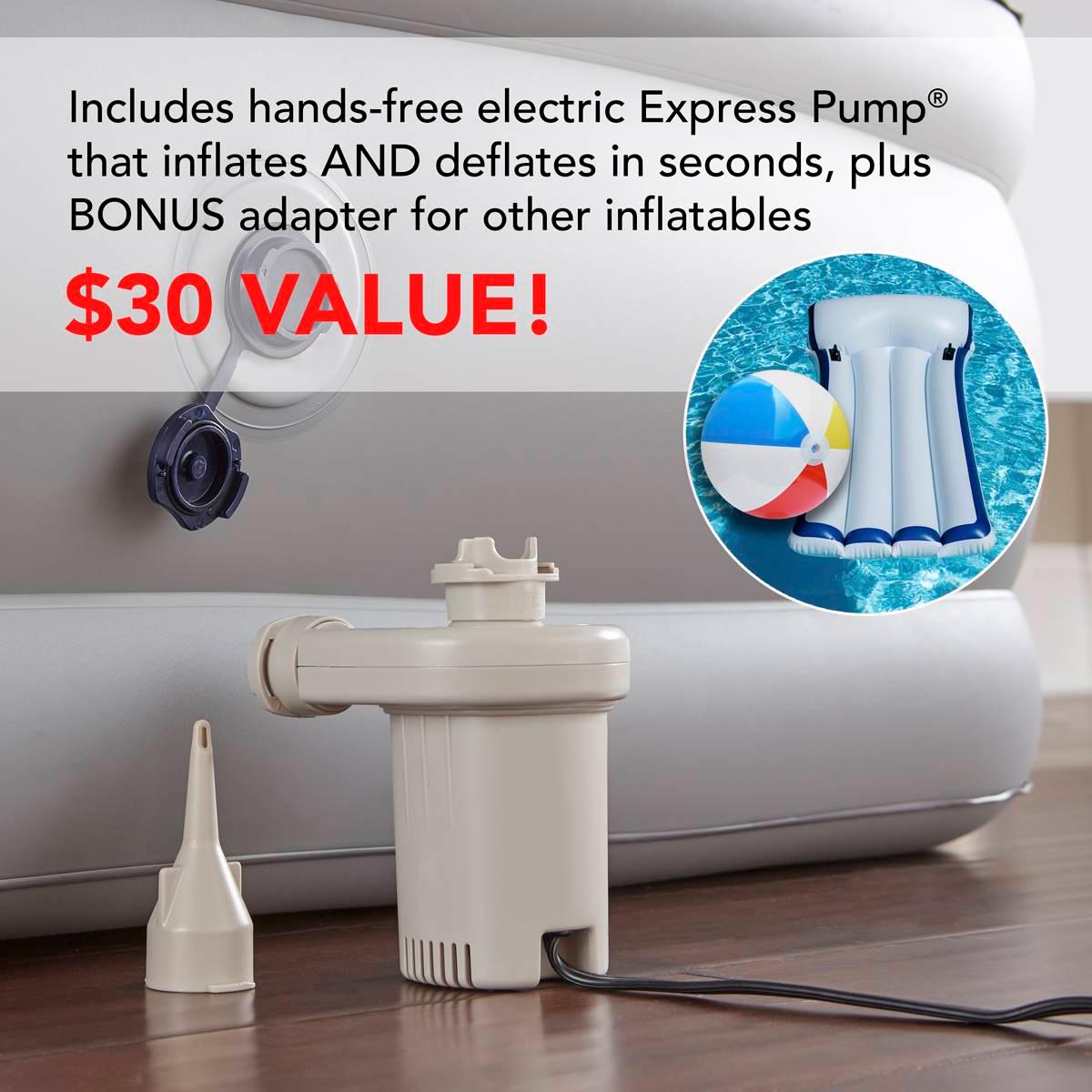 • Hands free powerful electric express pump that inflates and deflates in seconds, plus a bonus adapter for other inflatables