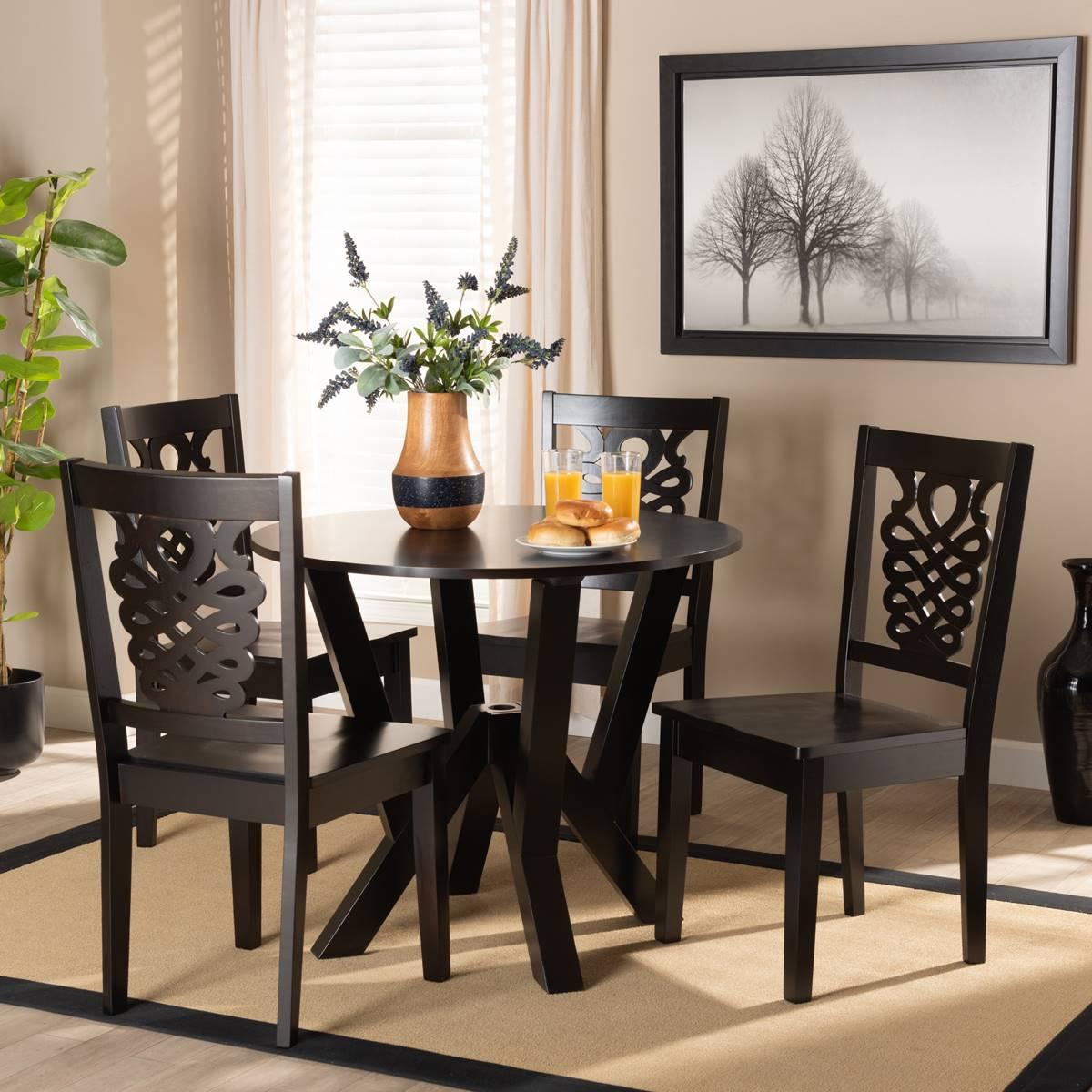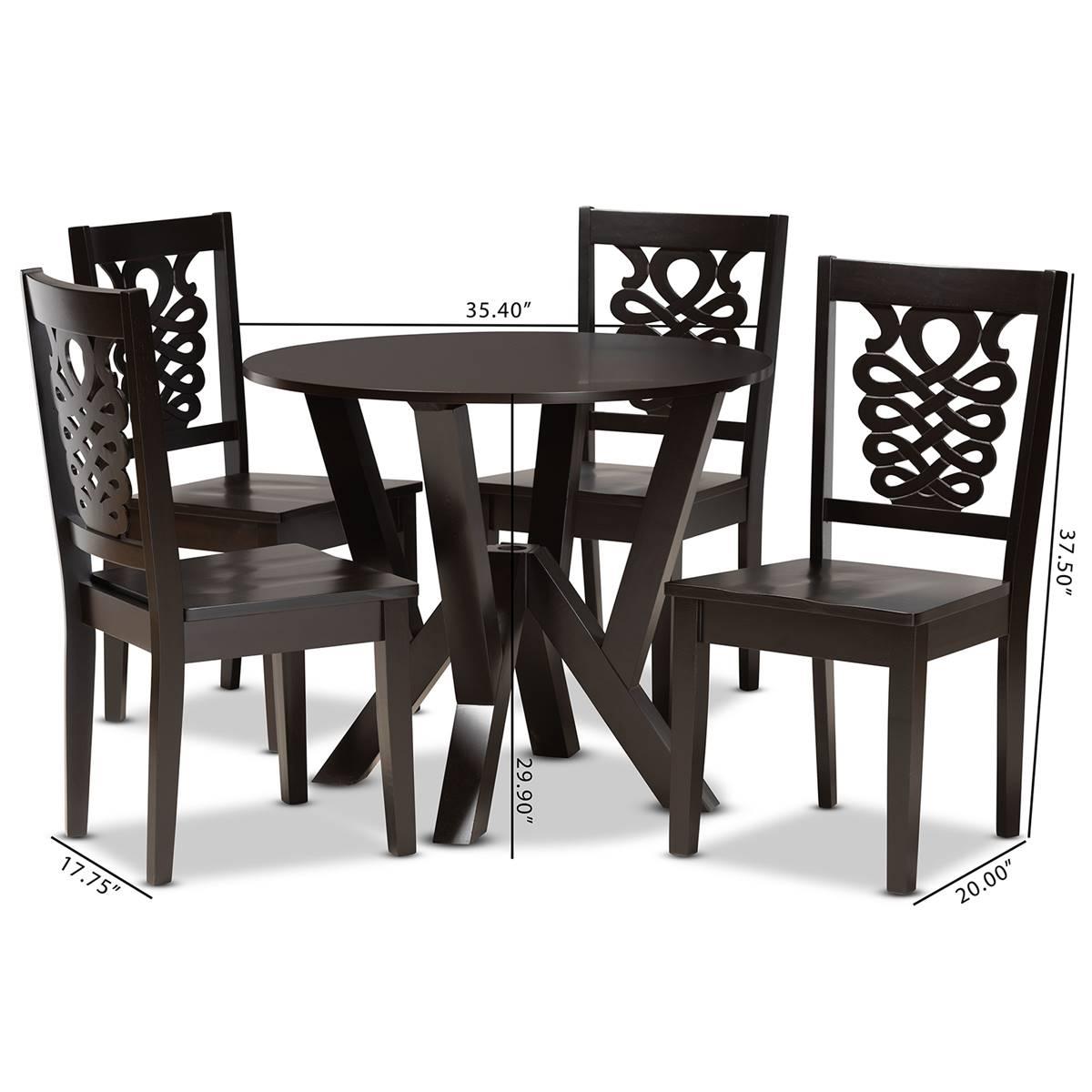 Imbue your dining space with the elegance of the contemporary transitional finely crafted Baxton Studio Valda dining set. Made in Malaysia, this wooden set includes one table and four chairs showcasing a rich dark brown finish.