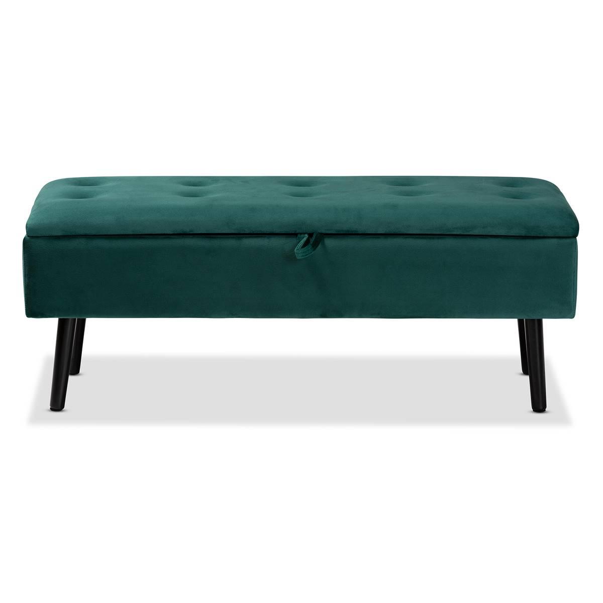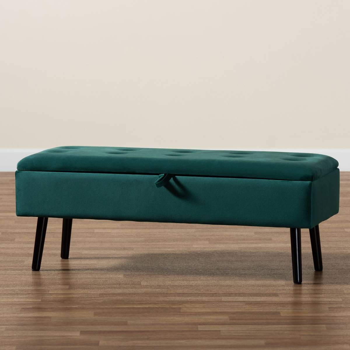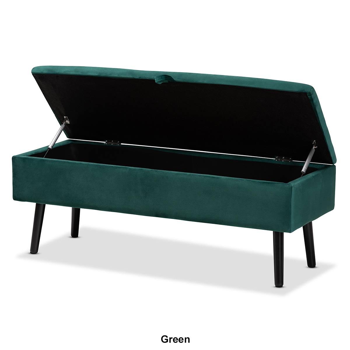 Stylish and practical, the Baxton Studio Caine storage bench expands the potential of any interior space. Made in China, this bench is comprised of a sturdy wood frame padded with foam and upholstered in sumptuous velvet fabric. The button-tufted cushion opens to reveal a spacious storage compartment for extra pillows, blankets, and more. Requiring assembly, the Caine utilized angled legs for excellent stability and support while lending a traditional feel. A wonderful addition to a living room, bedroom, or entryway, the Caine storage bench enhances any space.