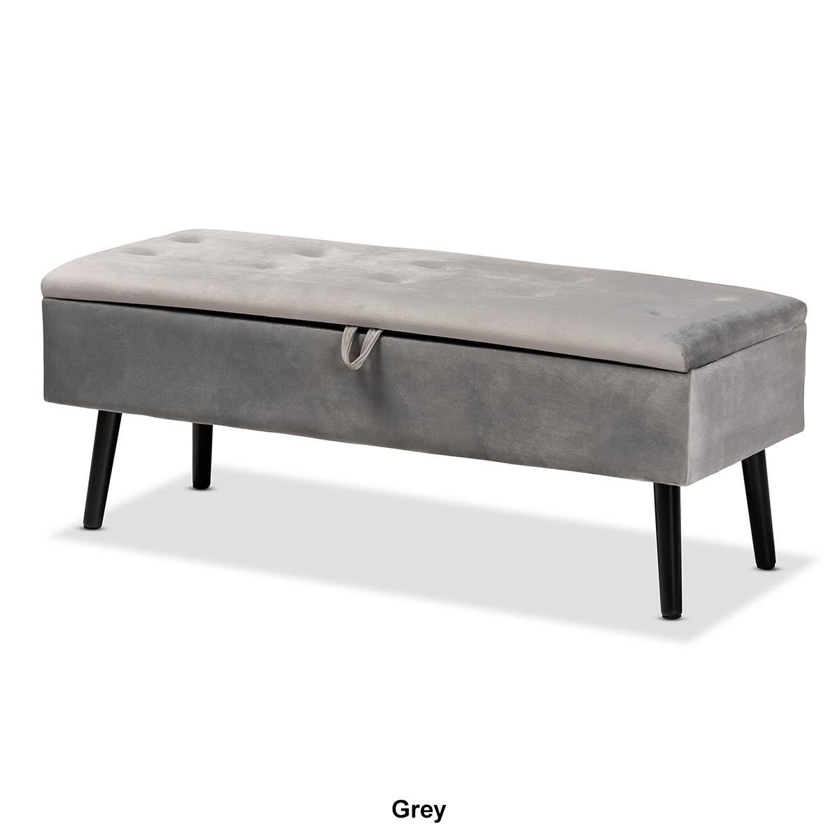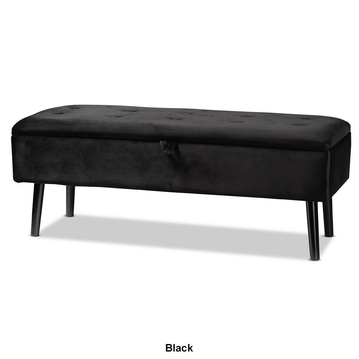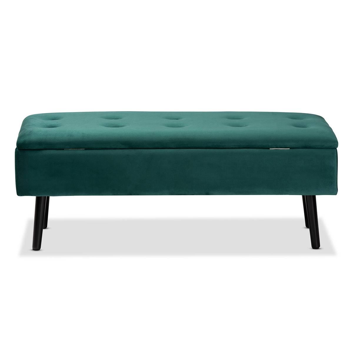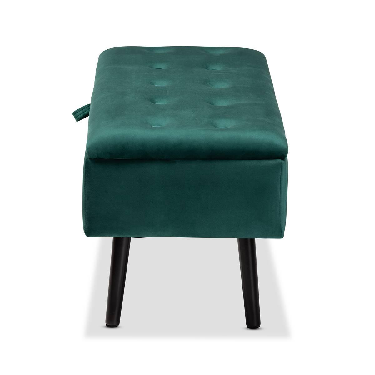 Stylish and practical, the Baxton Studio Caine storage bench expands the potential of any interior space. Made in China, this bench is comprised of a sturdy wood frame padded with foam and upholstered in sumptuous velvet fabric. The button-tufted cushion opens to reveal a spacious storage compartment for extra pillows, blankets, and more. Requiring assembly, the Caine utilized angled legs for excellent stability and support while lending a traditional feel. A wonderful addition to a living room, bedroom, or entryway, the Caine storage bench enhances any space.