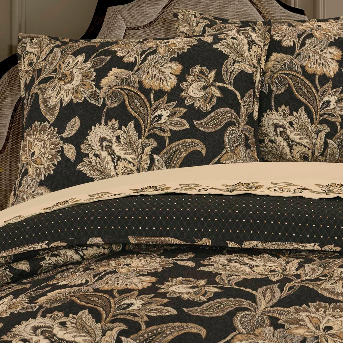 The Royal Court Montecito quilt Set features a beautiful multicolored floral Jacobean design. The quilt is embellished with a flange trim and reverses to a diamond dot design for added detail.
