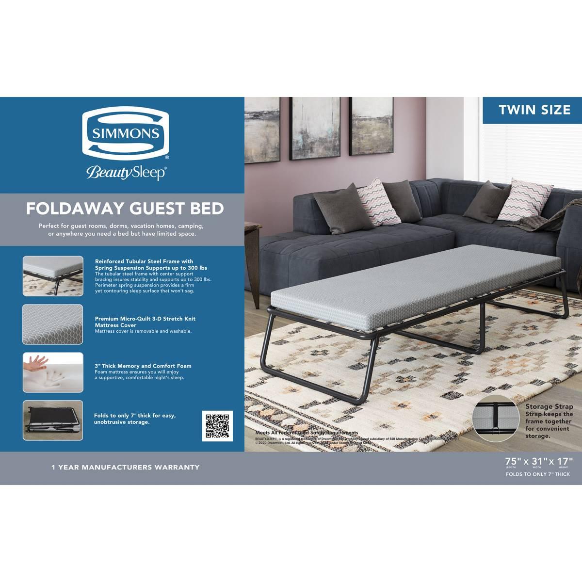 Description Look no further for a compact and portable guest bed. The Simmons Beautysleep foldaway guest bed with a memory foam mattress will fit the bill perfectly. This guest...