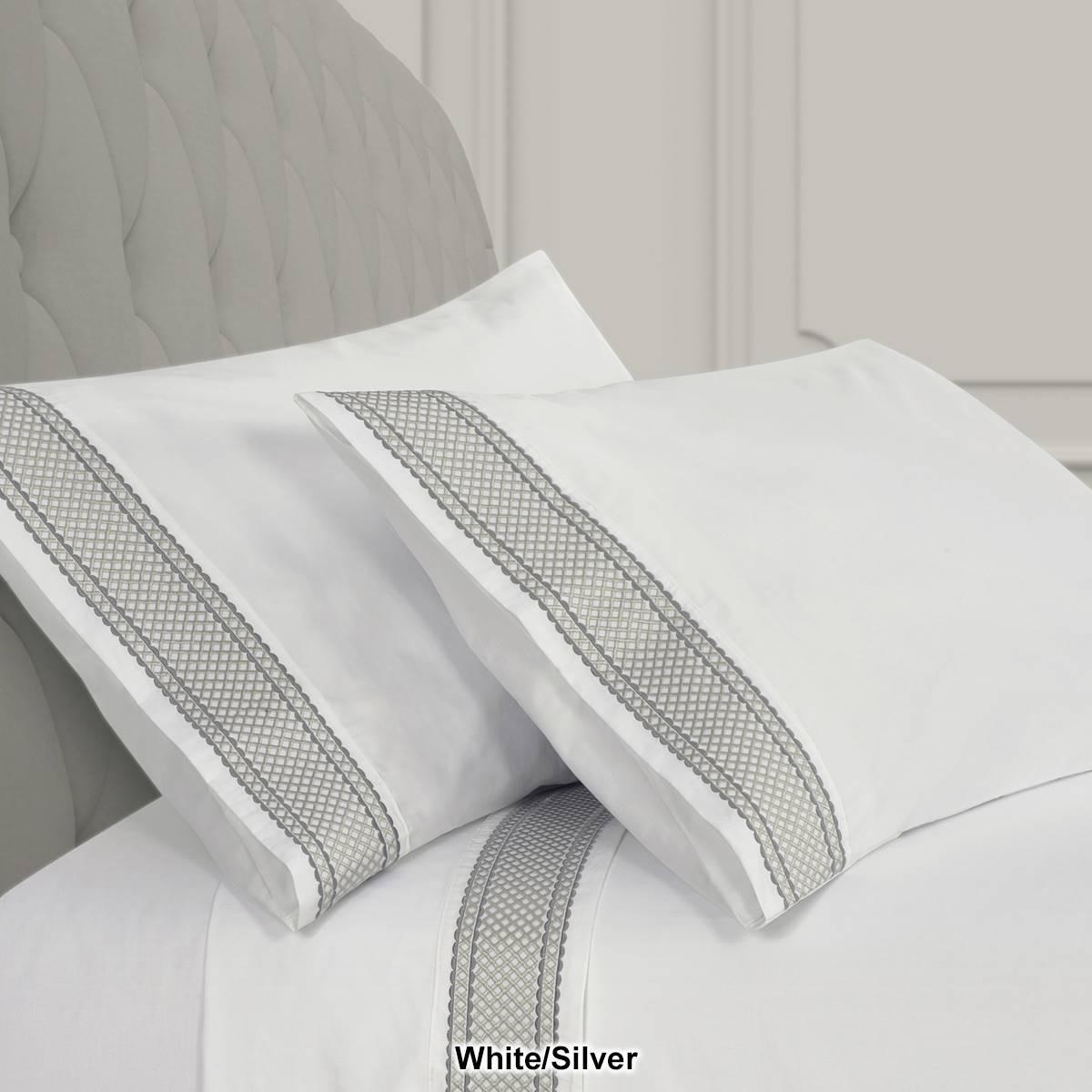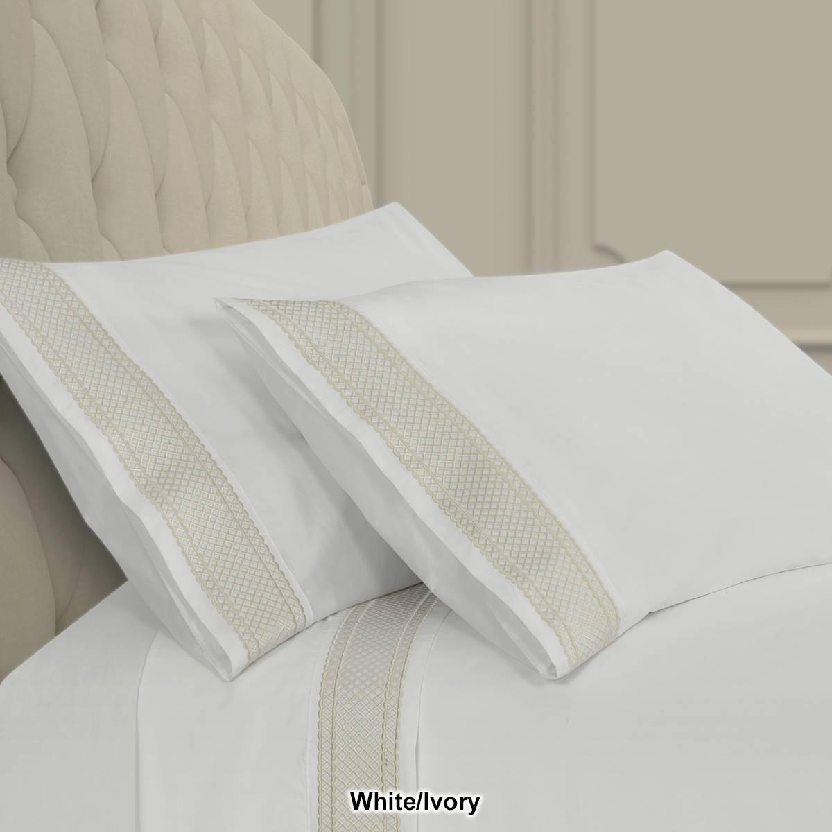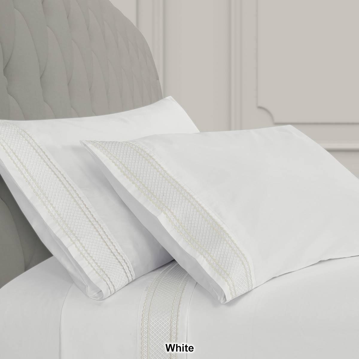 Add a luxurious foundation to your bed with the J. Queen New York Monarch pillow case pair. Features an embroidered border design, carefully constructed around the centered lattice design. The border is framed with a darker scalloped edge on the top and bottom, providing a dimension of the decorator´s detail.