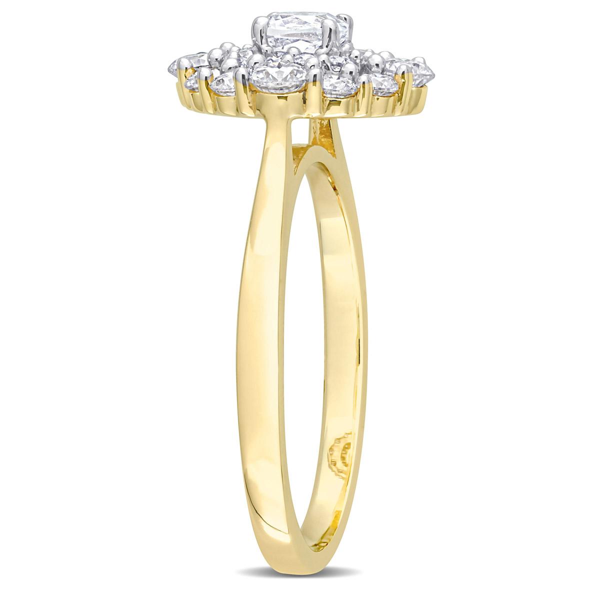Make her heart flutter with this Gemstone Classics™ 10kt. yellow gold 1ctw. moissanite ring. Features a cushion-cut, prong-set created sapphire gemstone at the center with a halo of 12 round-cut buttercup-set and 12 round-cut, prong-set created moissanite gemstones. The perfect gift for your beloved.
