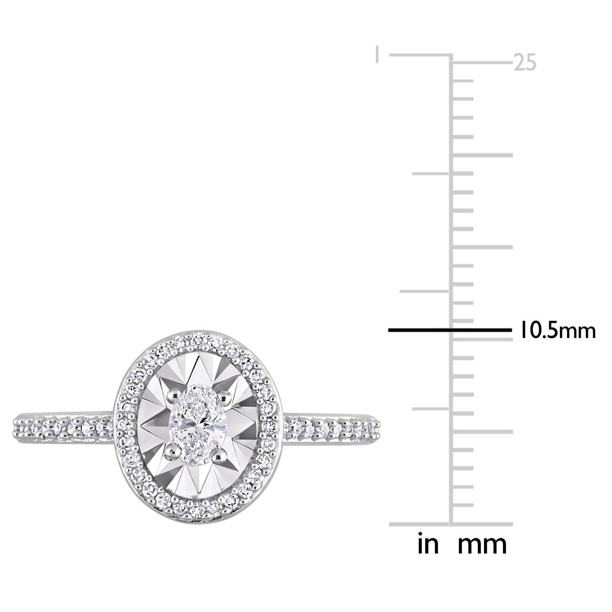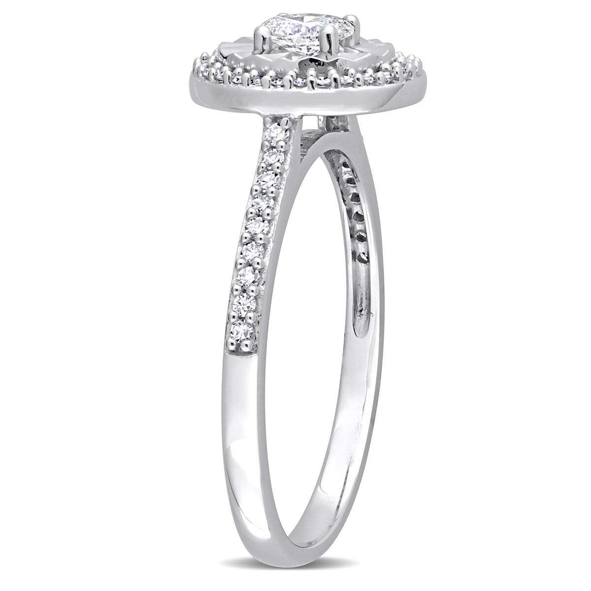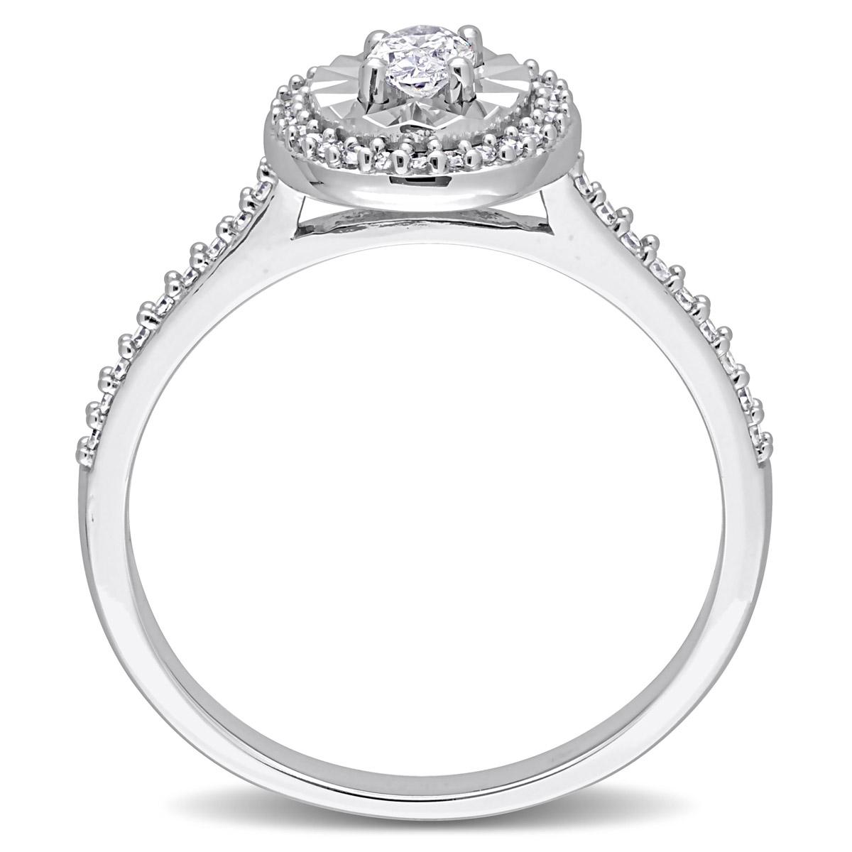 This Diamond Classics™ 14kt. white gold 1/3ctw. diamond ring is the perfect pick that never goes out of style. Features one oval-cut, 4-prong set white diamond in the center surrounded by an oval illusion plate. The ring is the easiest way to add a statement to your look.