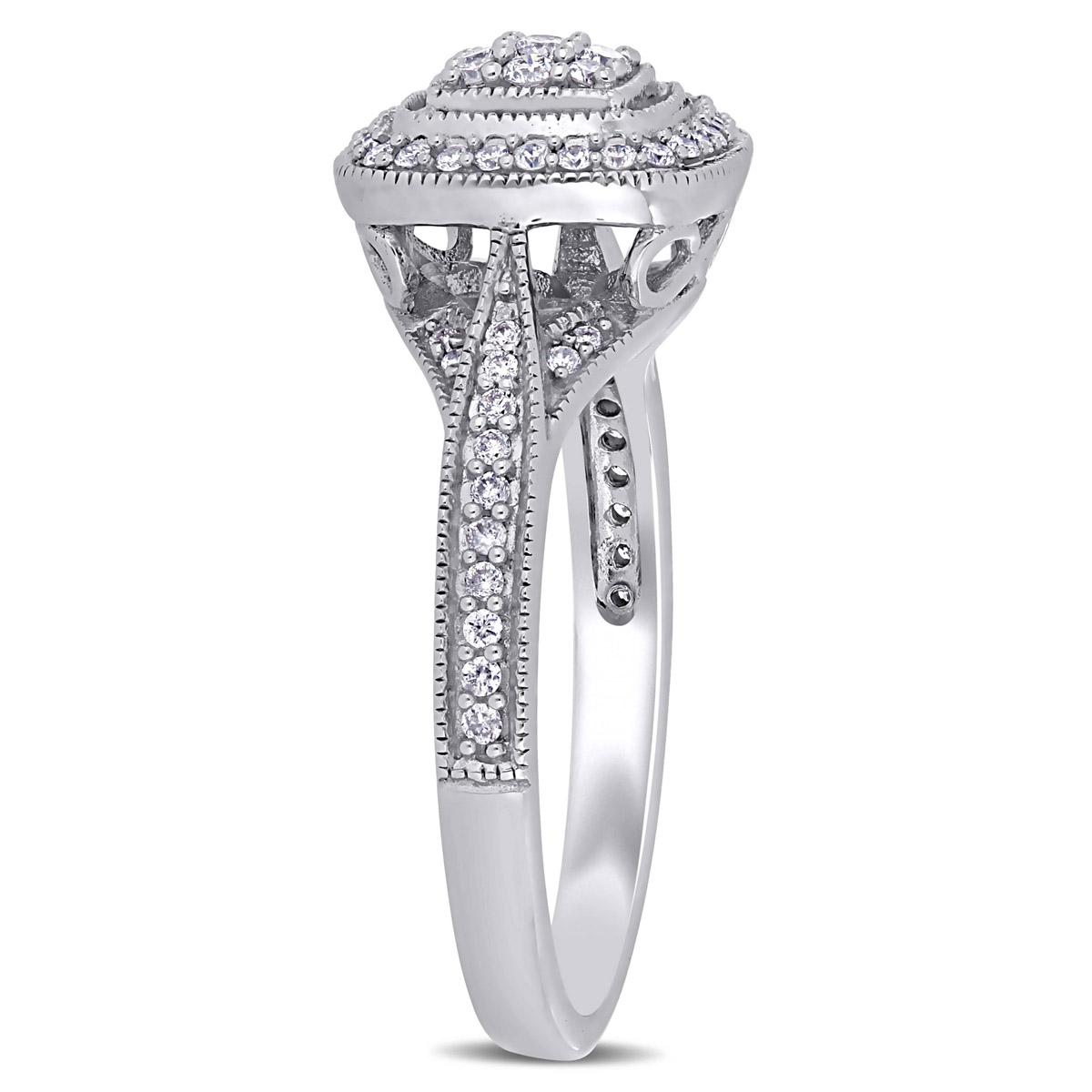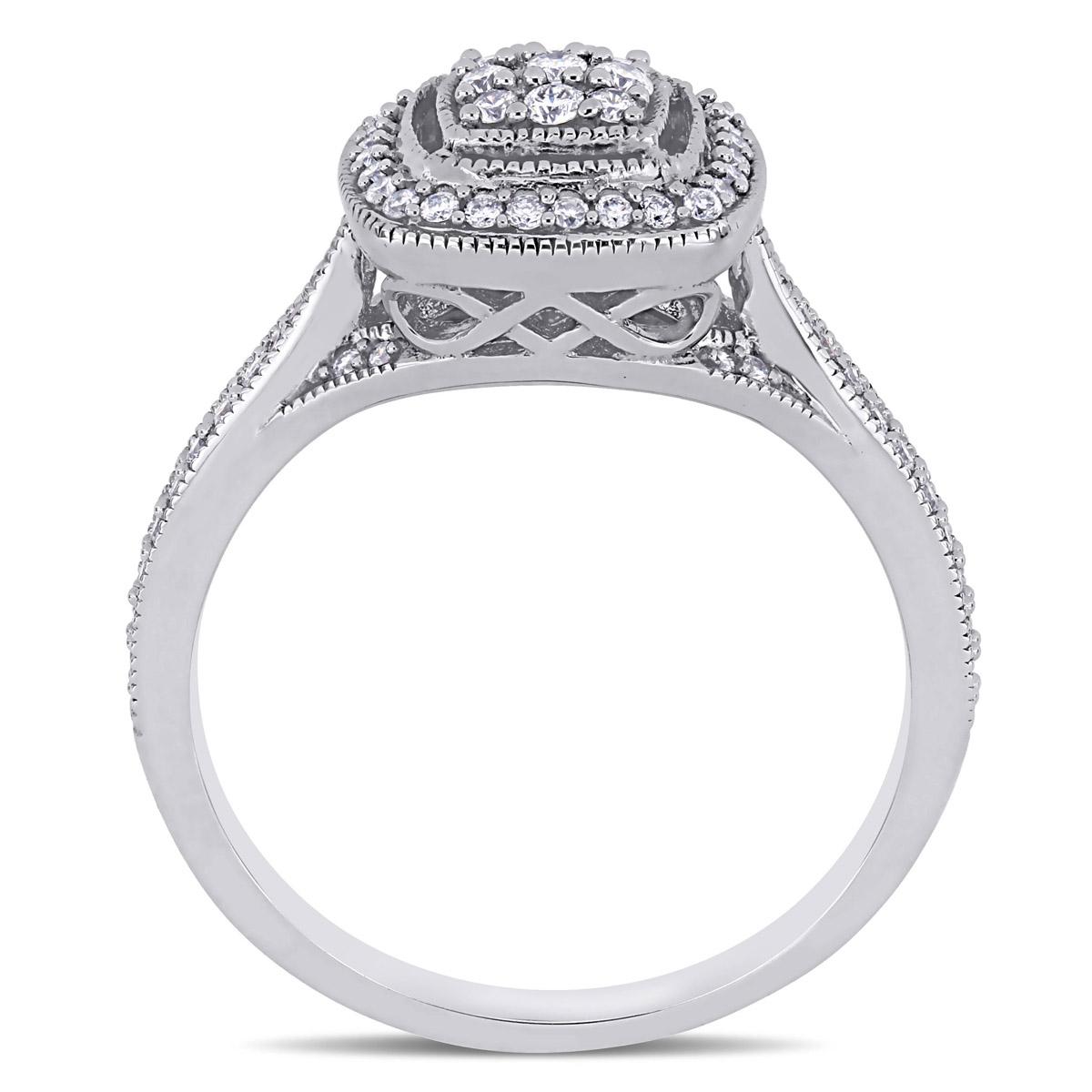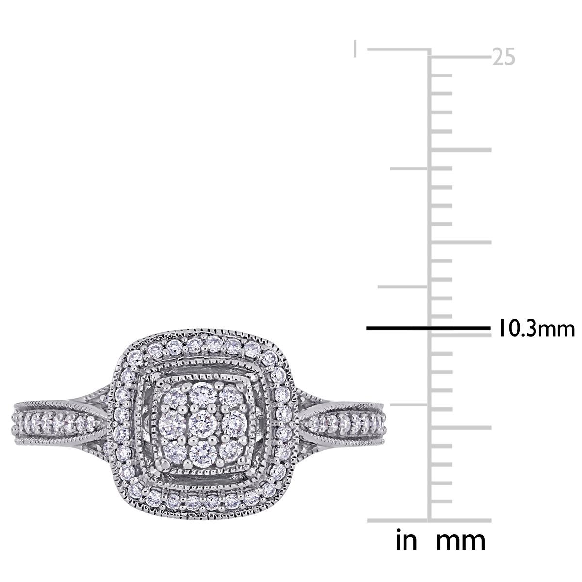 This Diamond Classics™ 10kt. white gold 1/3ctw. diamond engagement Ring is perfect for the woman you love as you celebrate this special milestone and begin the next chapter of your lives together. Features nine round-cut, prong-set diamonds in a clustered square design at the center along with 56 round-cut glistening diamonds.