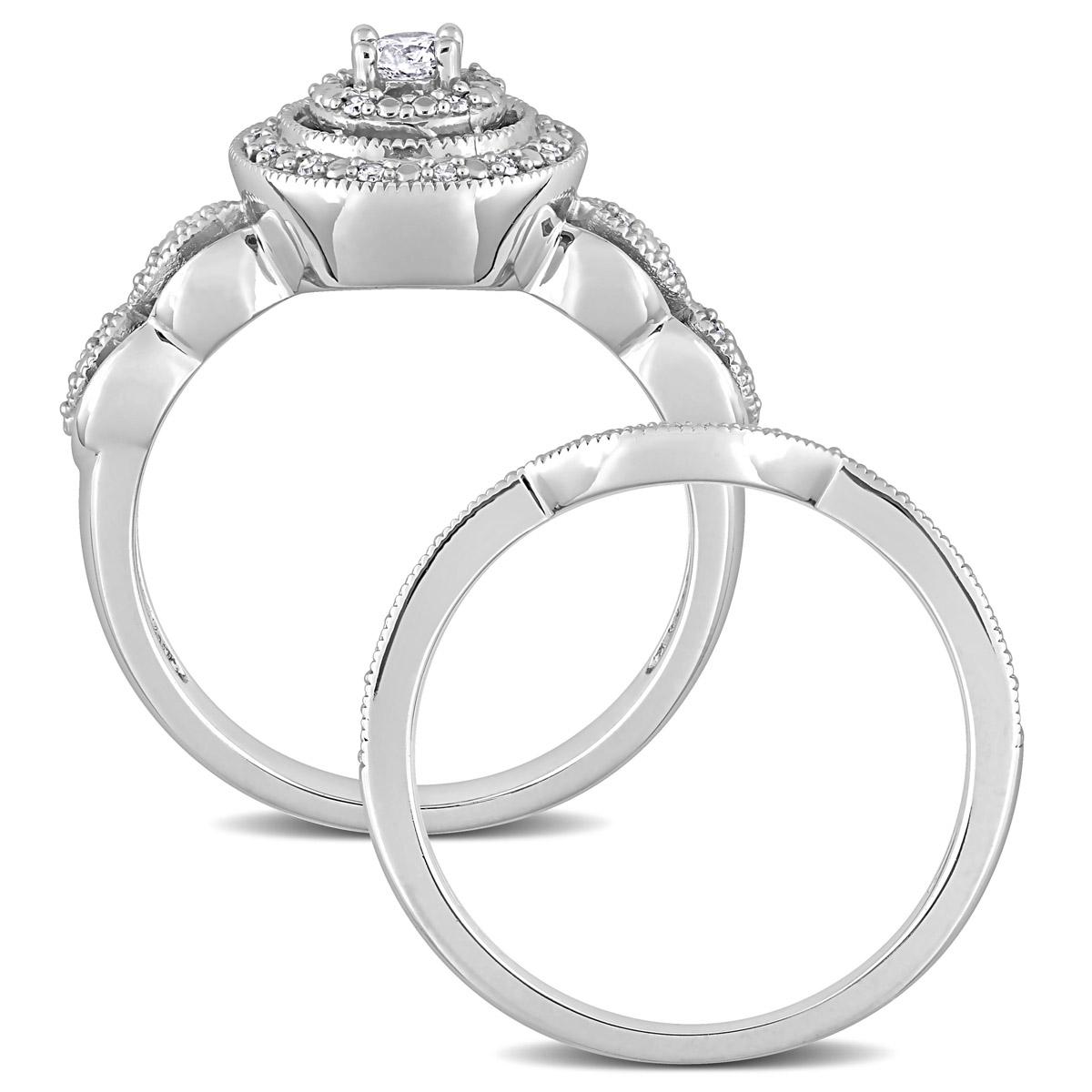 Choose this Diamond Classics™ 10kt. white gold 1/4ctw. diamond bridal set for the woman you love. Features 37 round-cut, pave, and prong-set glistening diamonds in a unique double halo design.