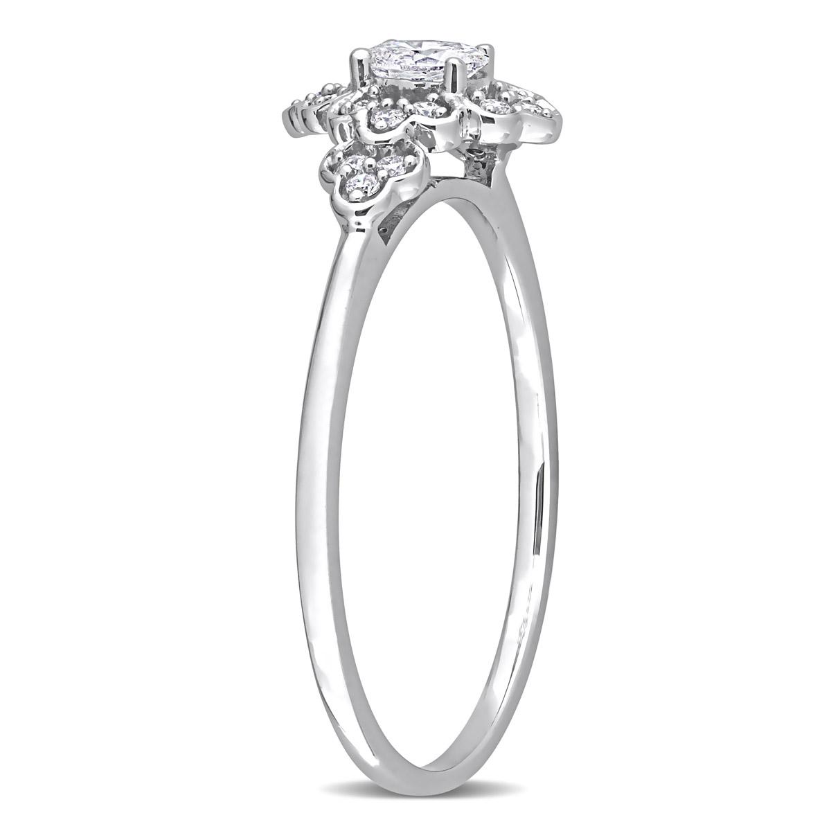This Diamond Classics™ 14kt. white gold 1/4ctw. diamond engagement ring is a valuable addition to any jewelry collection. Features an oval-cut, prong-set sparkling diamond at the center along with 18 round-cut, pave-set diamonds in a unique floral bridal ring design.
