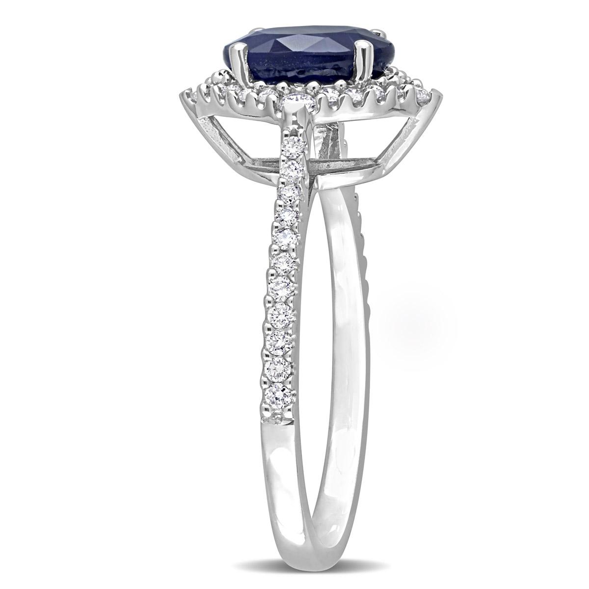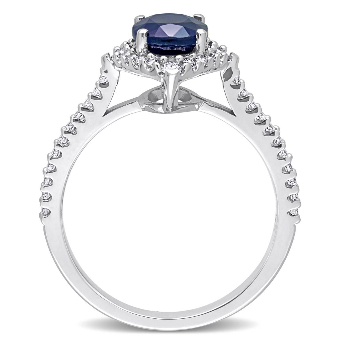 Description This classy Gemstone Classics™ halo ring is crafted in shimmering 14kt. white gold. This captivating ring features an oval-cut, prong-set sapphire gemstone at the...