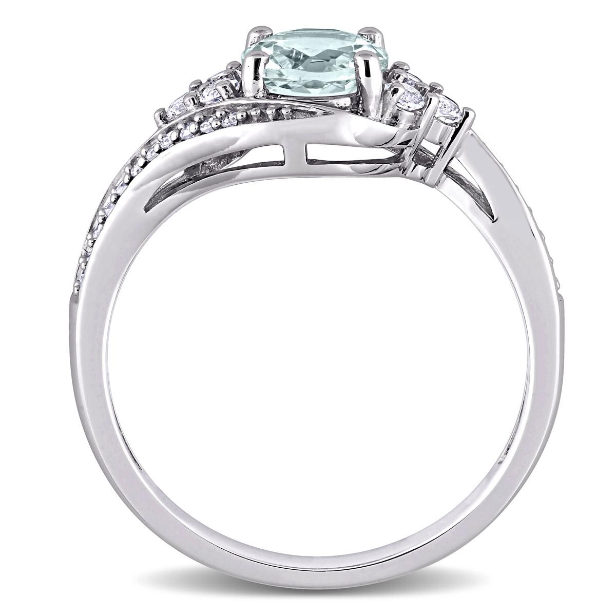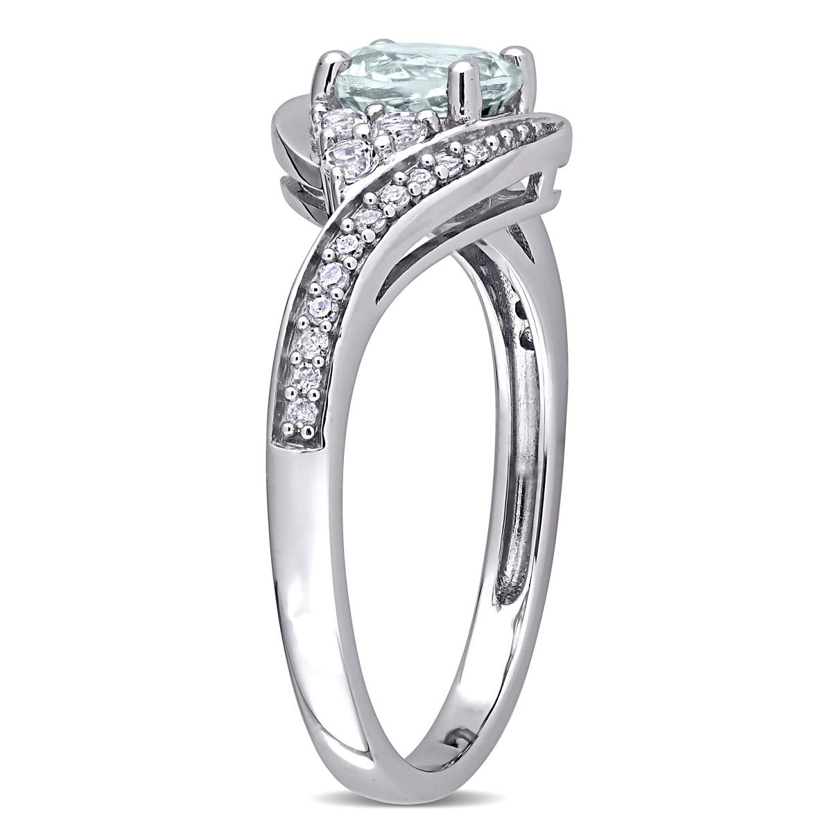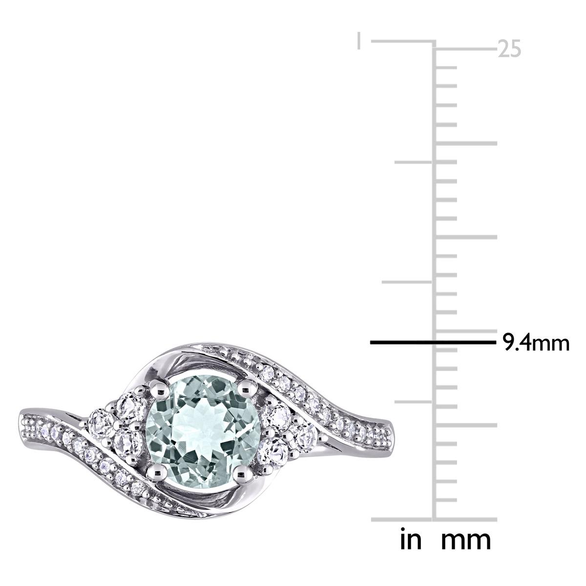 This charming Gemstone Classics™ bypass engagement ring is crafted in 10kt. white gold. This beautiful swirl wedding ring features a round-cut, prong-set gleaming aquamarine gemstone at the center embellished by six round-cut, prong-set white topaz gemstones and 22 round-cut gleaming white diamonds. Pretty and unique, this beautiful gemstone and diamond ring makes a lovely and thoughtful gift. Dazzle your loved one with this marvelous ring and make her feel special.