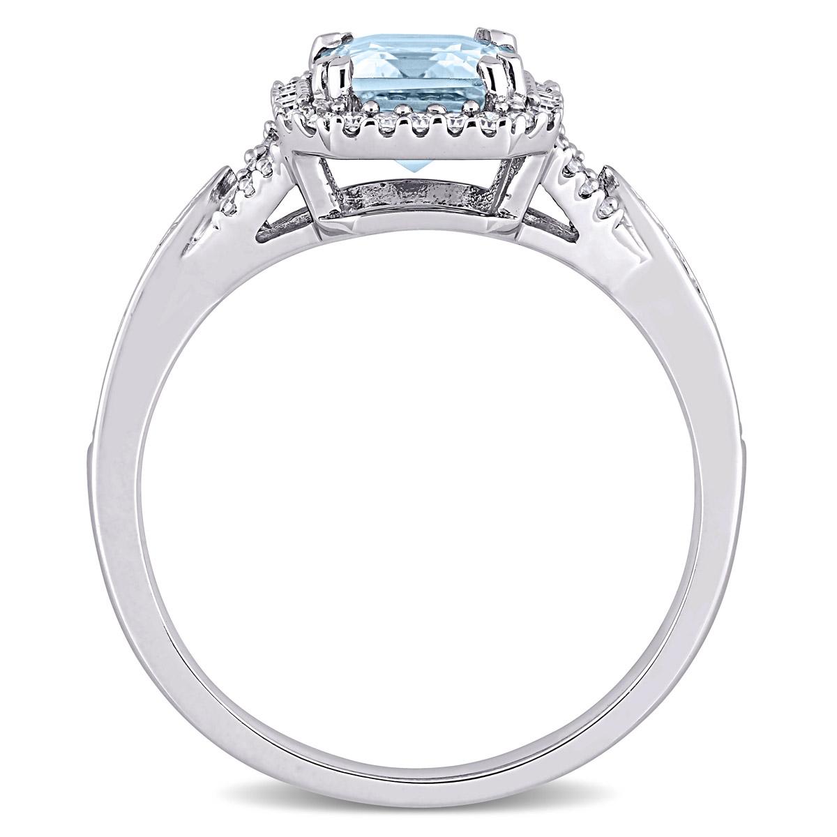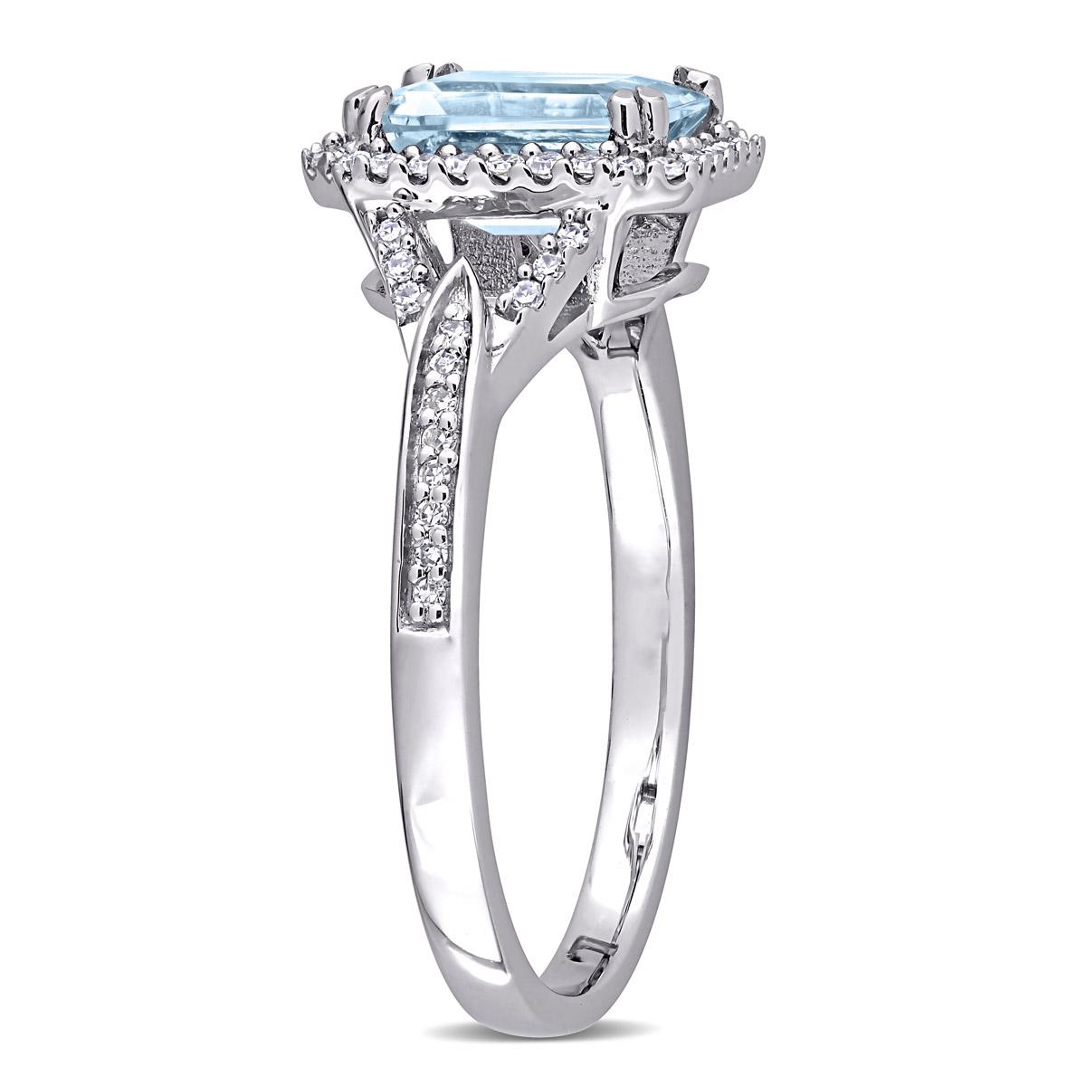This elegant Gemstone Classics™ halo engagement ring is crafted in 14kt. white gold to add luminous appeal to your style. This wedding ring features an octagon-cut, prong-set shiny aquamarine gemstone at the center surrounded by 58 round-cut, pave, and buttercup-set twinkling diamonds sliding down the band in a pattern for a trendy design. The highly polished cocktail ring will add an extra touch of shine to your favorite look. Gift this ring as a wonderful token of love and make your loved one feel special.