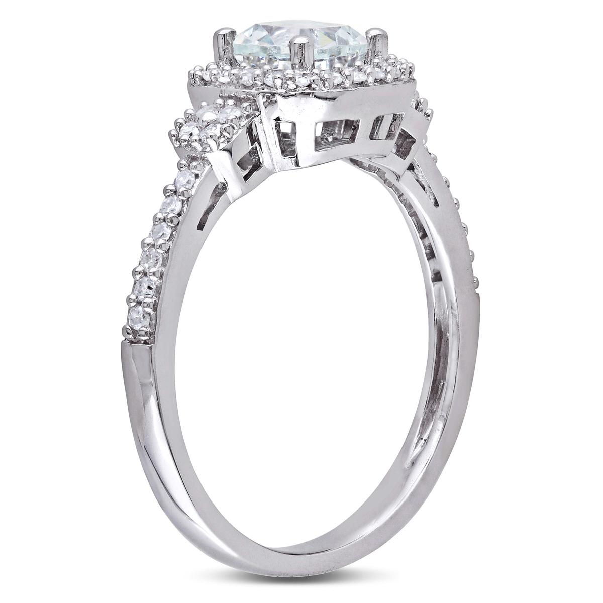 Description This glistening Gemstone Classics™ cocktail ring features a cushion-cut aquamarine center stone and round white diamond side stones. This exquisite ring is crafted...