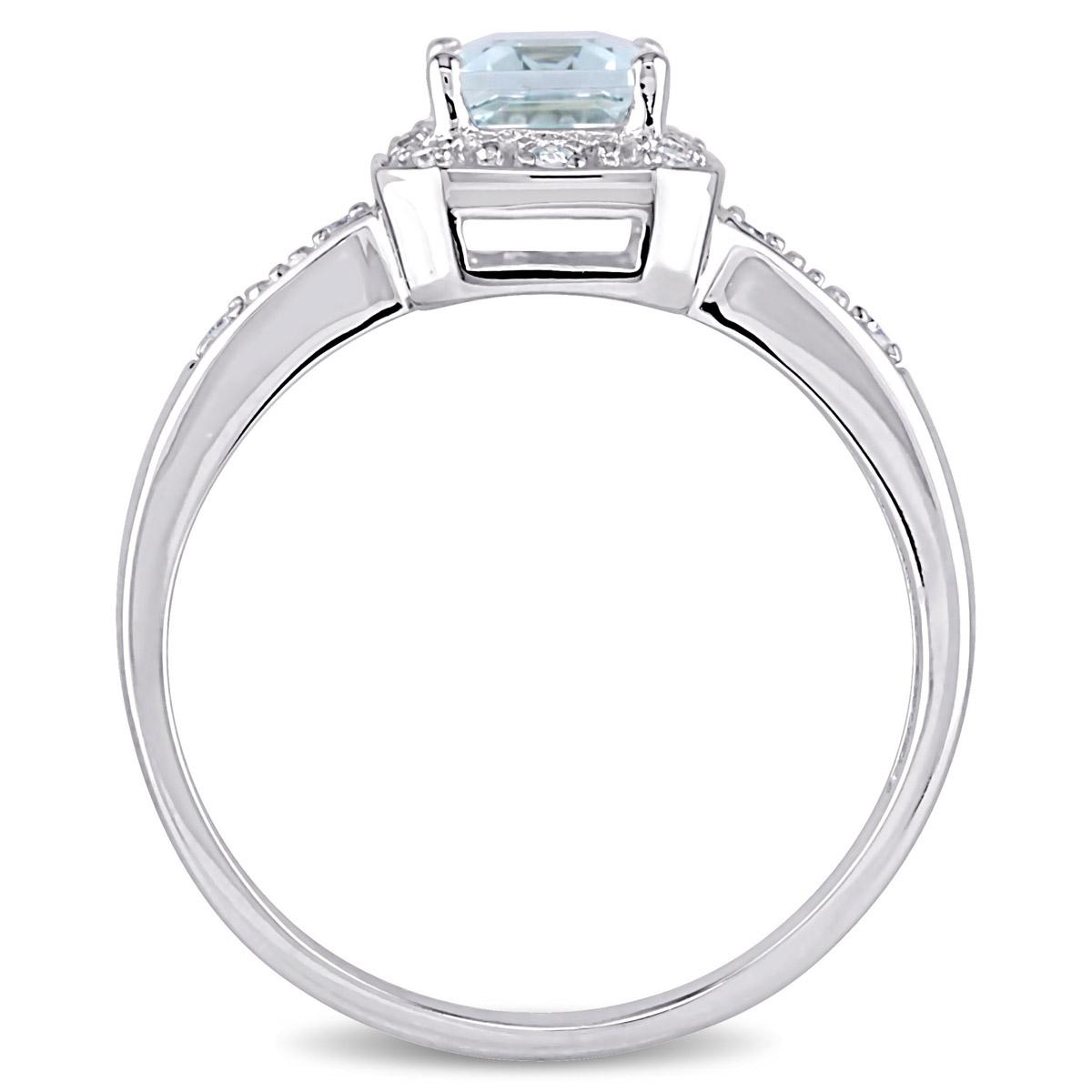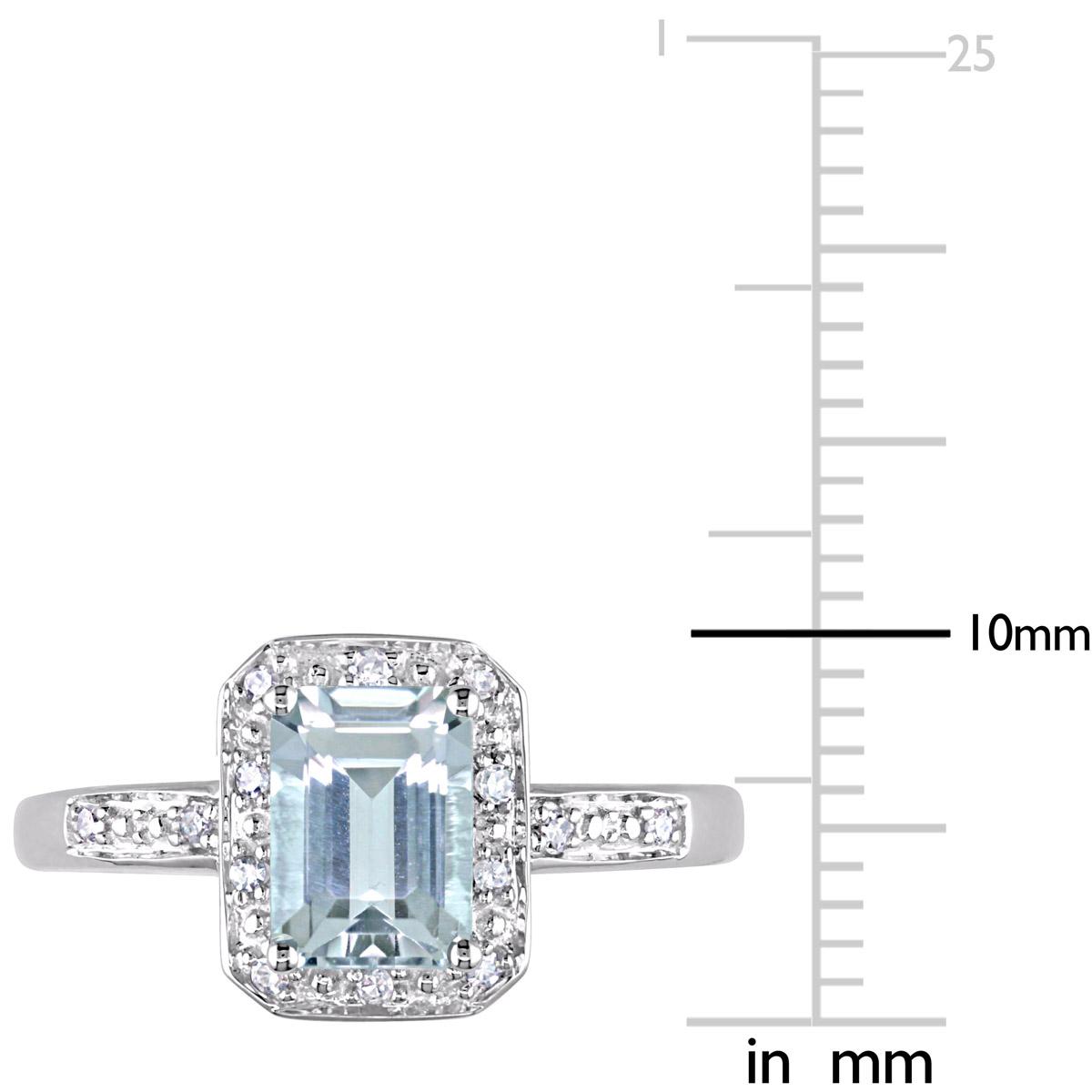 Dazzle and dance at your friend´s party with this dainty Gemstone Classics™ Miabella halo ring. Crafted in lustrous white gold, this splendid ring features an emerald-cut, prong-set aquamarine gemstone (7x5mm) at the center surrounded by 14 round-cut, pave-set diamonds. Enhanced with a high polished finish, this flawless ring will commence your journey to fame.