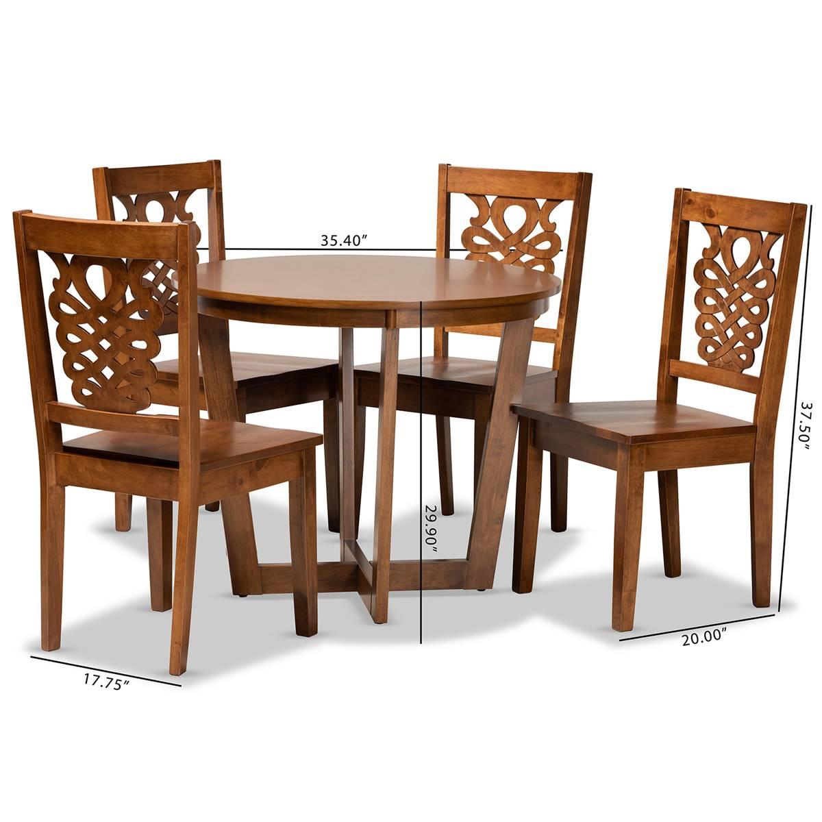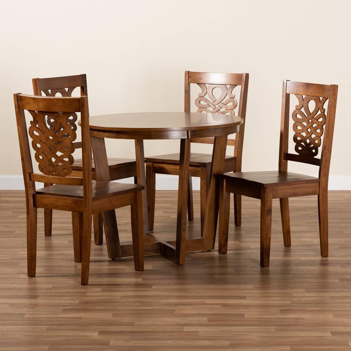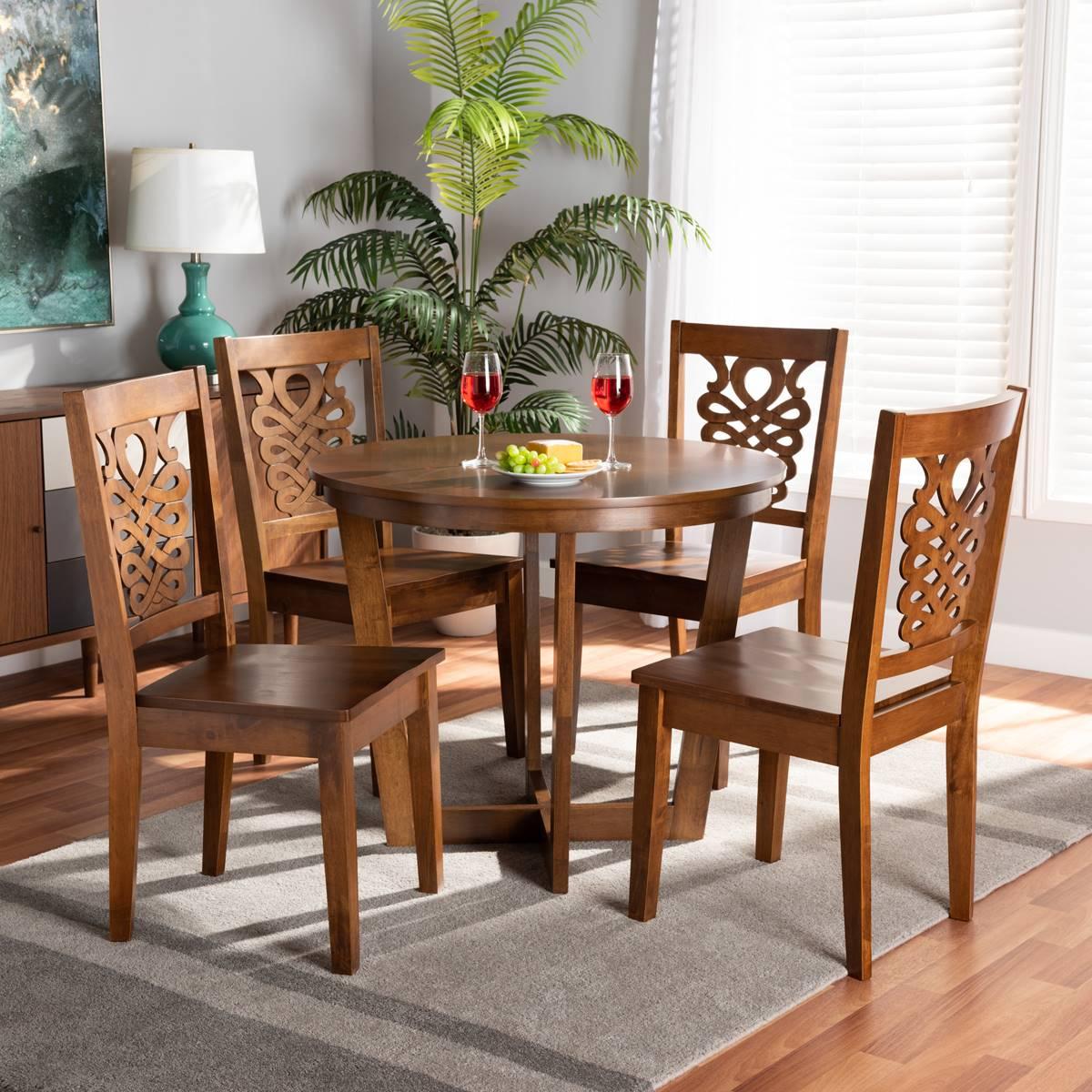 Description This Baxton Studio Salida modern and contemporary transitional 5-piece dining set finished in walnut brown wood. Imbue your dining space with the elegance of the...
