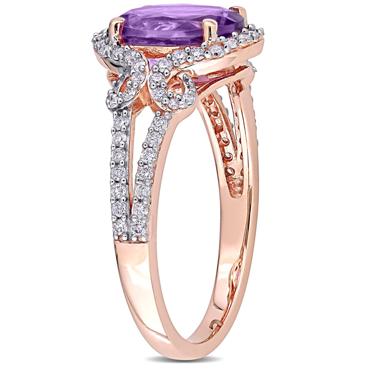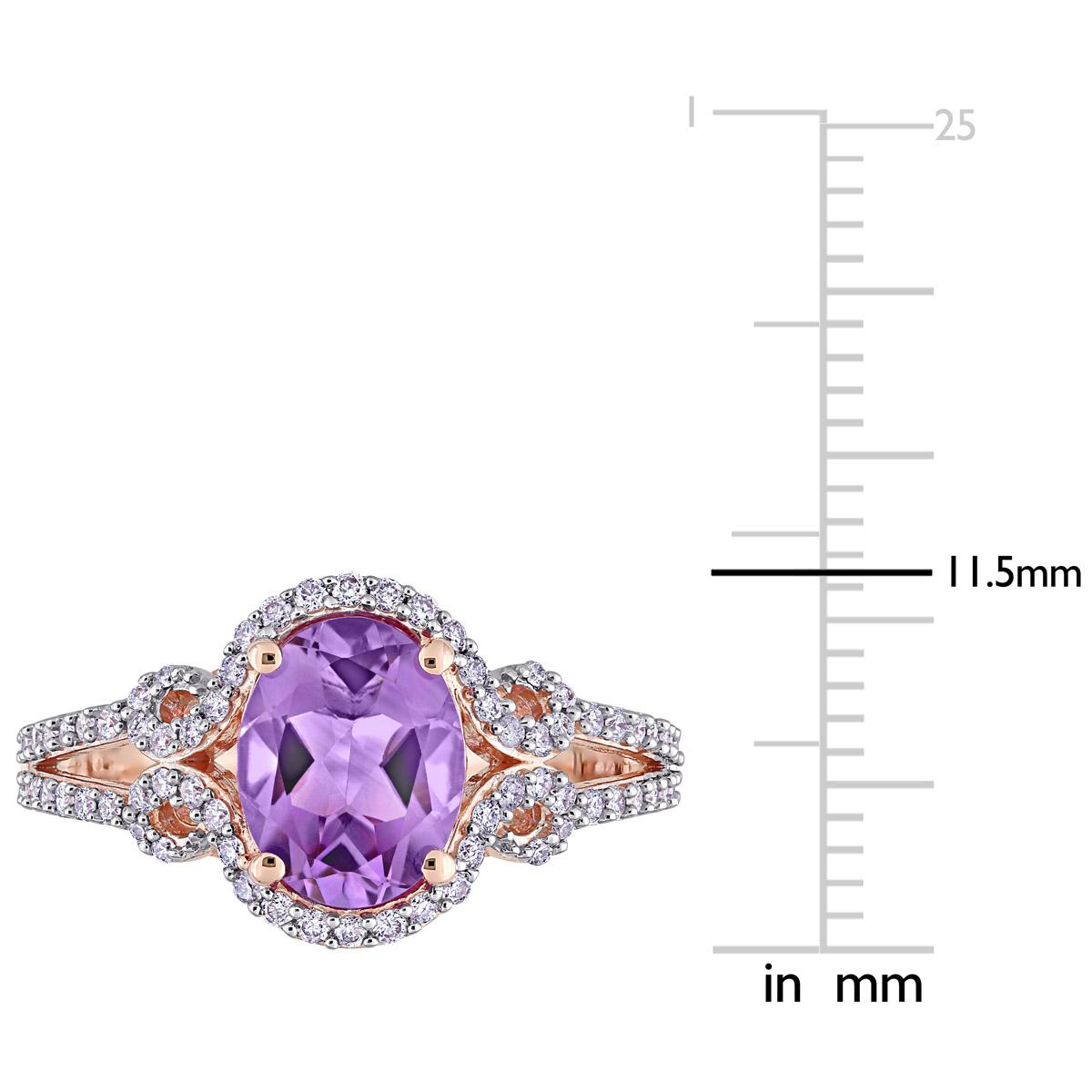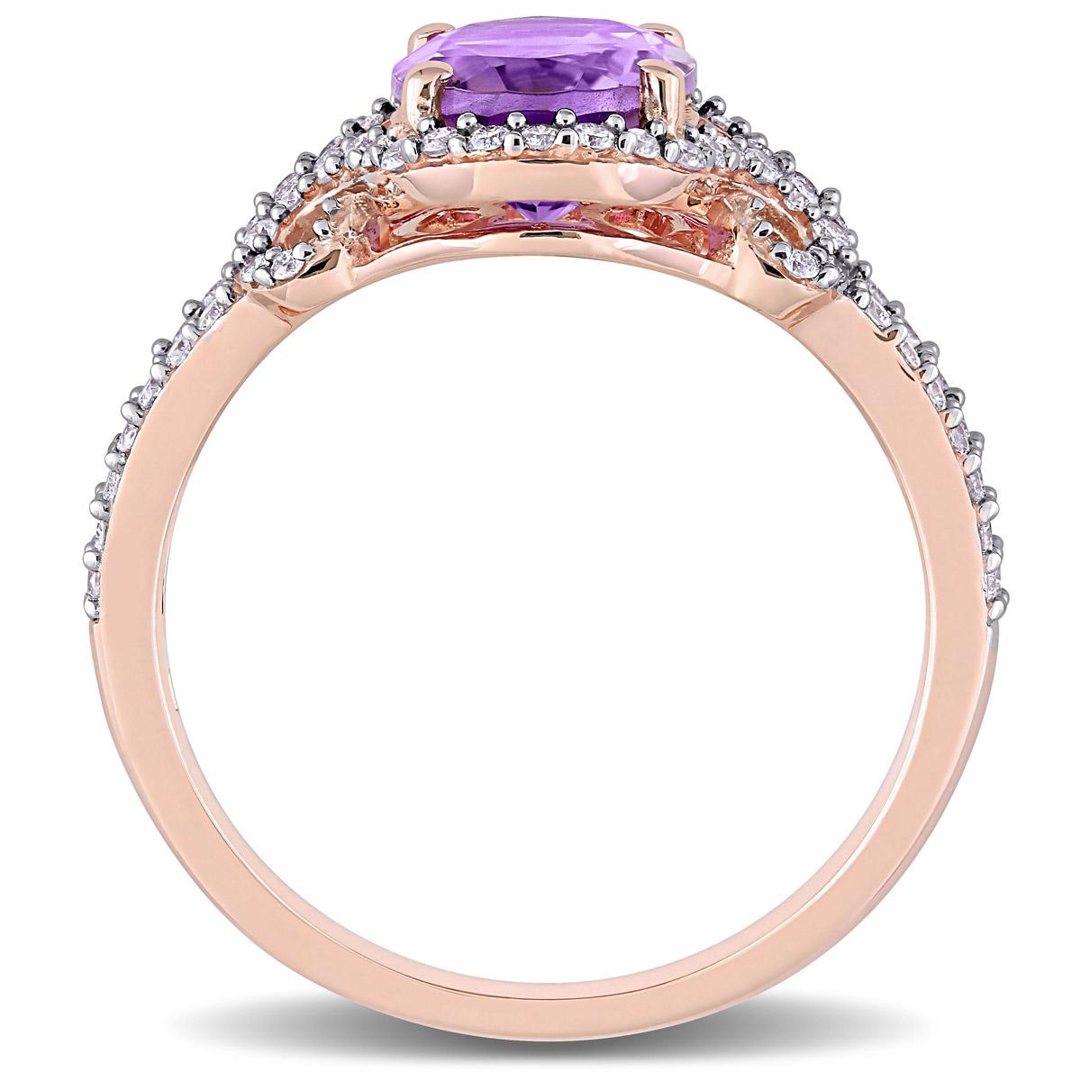 This magnificent Gemstone Classics™ halo split shank engagement ring is crafted in lustrous 14kt. rose gold. This beautiful halo wedding ring features an oval-cut amethyst center stone along with round-cut shimmering white diamonds beautifully embellished on the ring. This gemstone and diamond ring will add style and class to any look. Enhanced with a high-polish finish, this cocktail ring is a valuable addition to any jewelry collection.