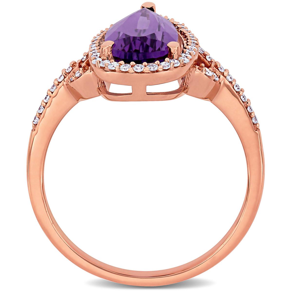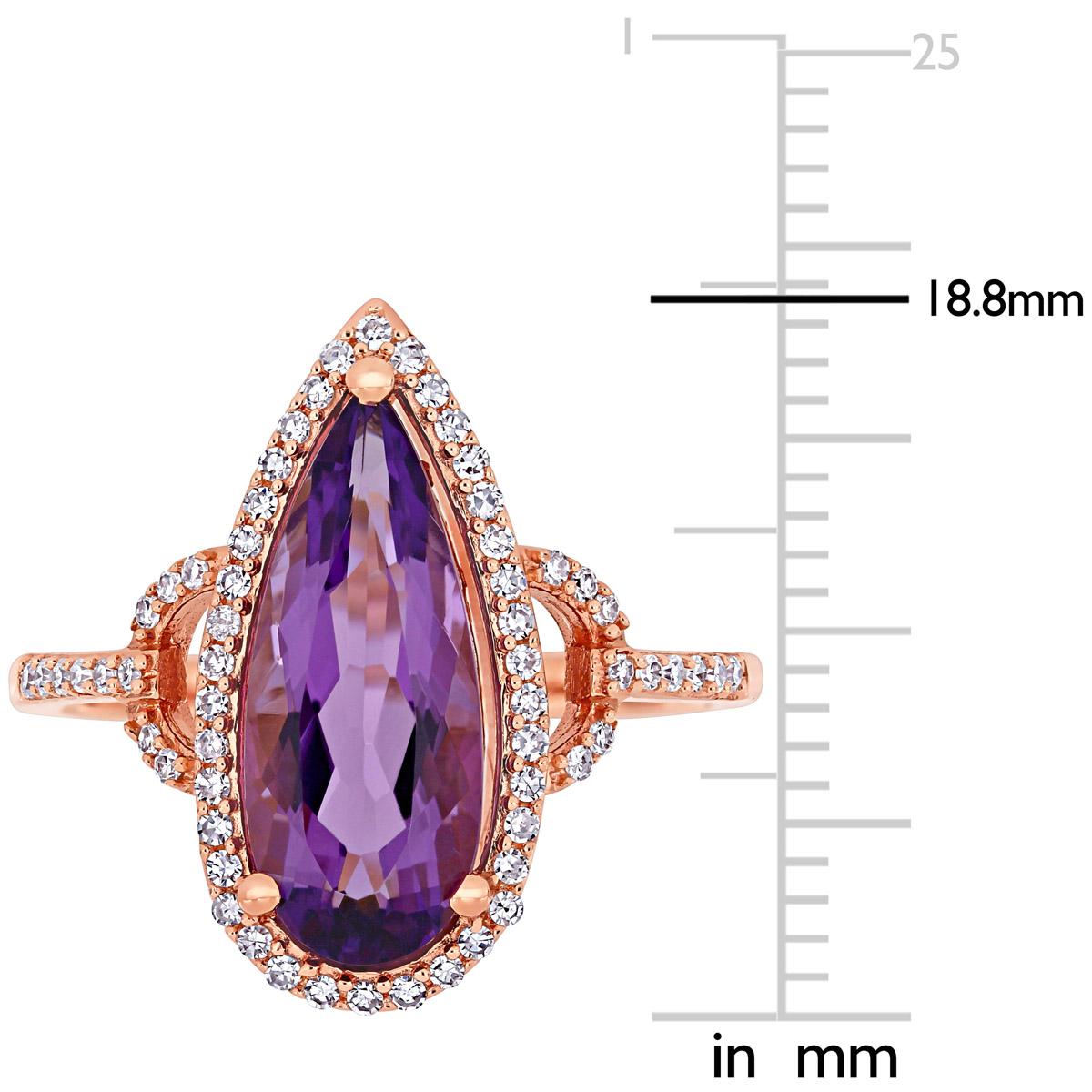Exude style and grace with this Gemstone Classics™ halo teardrop cocktail ring. Crafted in lustrous rose gold and features a pear-cut amethyst gemstone at the center with a halo of round-cut shimmering diamonds. Additional diamonds are studded on its shank. Enhanced with a high-polish finish, this gemstone and diamond ring is the perfect addition to any jewelry collection. This ring arrives nicely packaged and is ready for gifting.