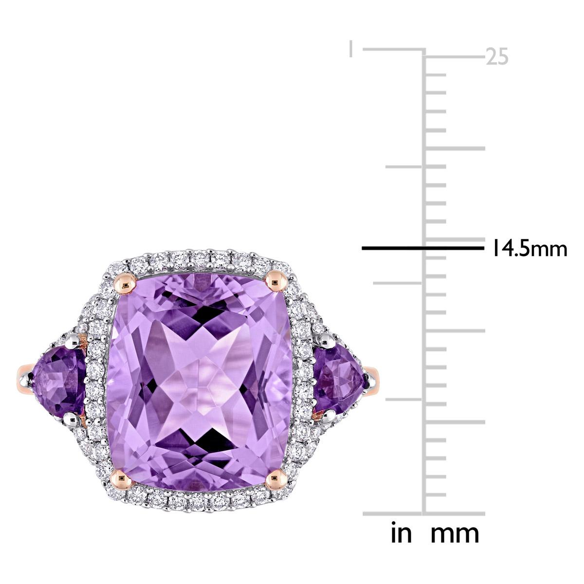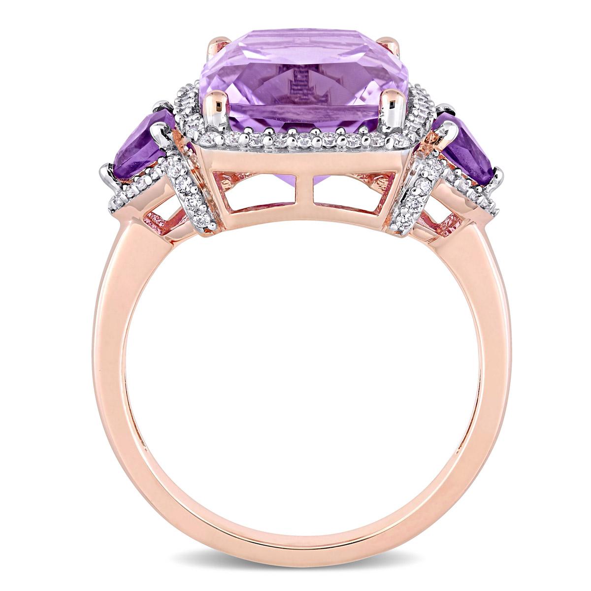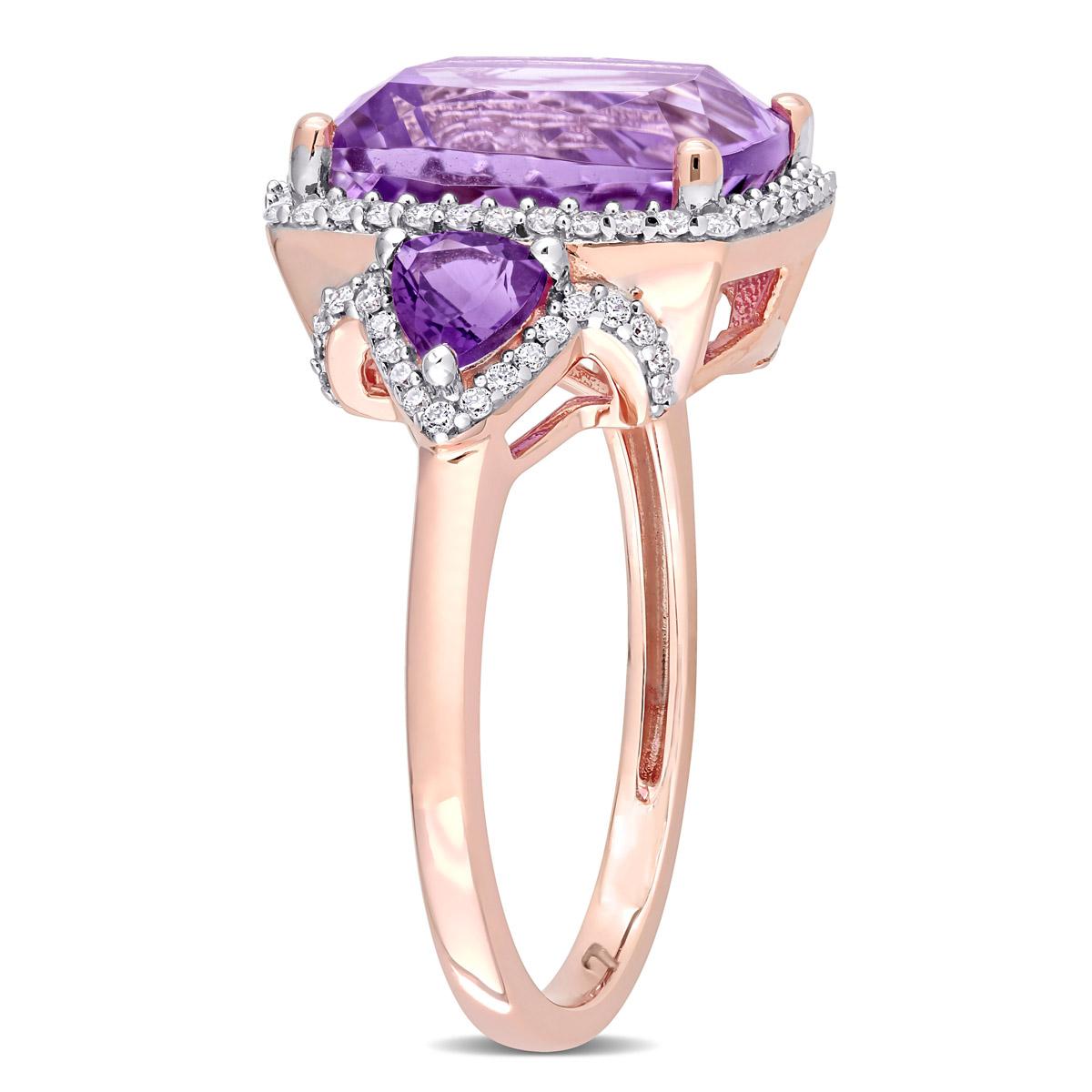 This extraordinary Gemstone Classics™ halo three-stone cocktail ring is crafted in radiant 14kt. rose gold. This exquisite ring features a cushion-cut rose de france center stone surrounded by a halo of round shimmering white diamonds flanked by a trillion-cut African amethyst on each side. Wear this gemstone and diamond ring on your next evening out and make heads turn. Enhanced with a high polish finish, this is a perfect gift for the woman with a unique, classy, and trendy sense of style. This beautiful bold cocktail ring is a standout addition to any jewelry collection.