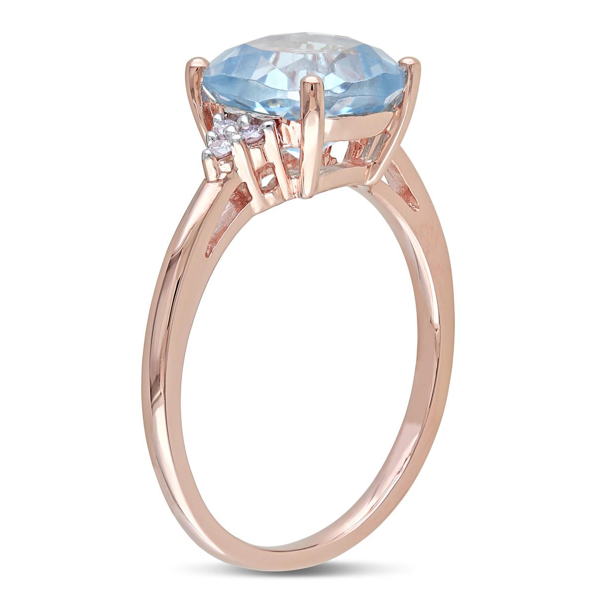 This stunning Gemstone Classics™ ring features a cushion-cut sky blue topaz center stone flanked by three round white diamonds on each side. This lovely ring is crafted of fine 10kt. rose gold and glimmers with a high polish finish.
