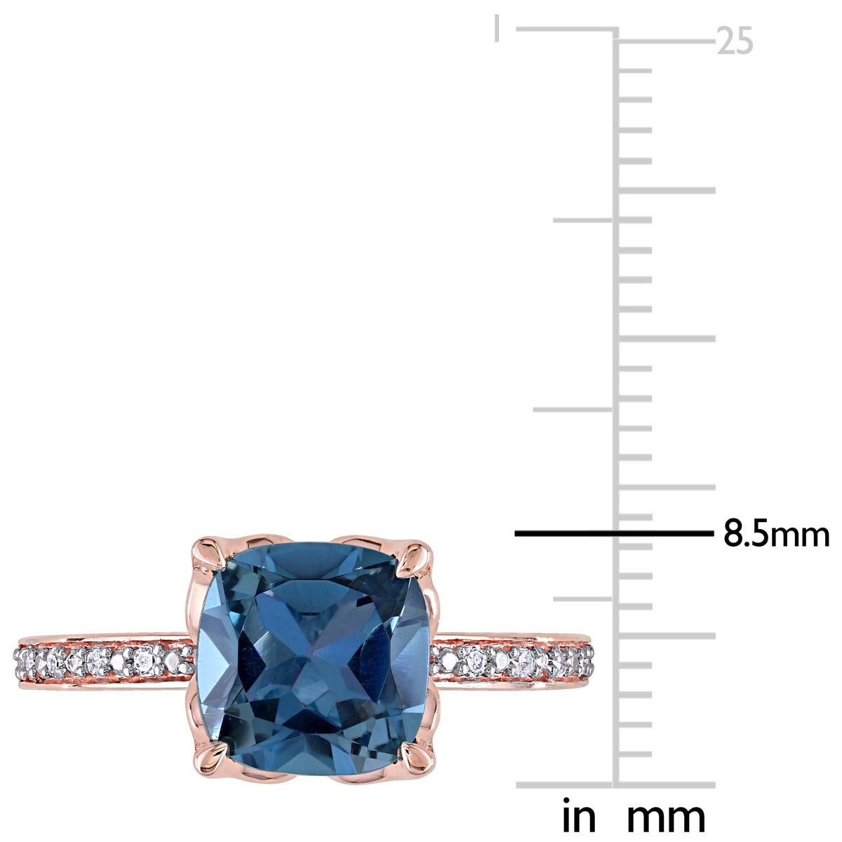 Graceful and romantic, this charming Gemstone Classics™ London blue topaz and diamond ring is beautifully crafted in 10kt. rose gold to add a touch of refinement and elegant style to your look. A sumptuous, cushion-cut London-blue topaz is raised over the delicate shank with petal-shaped prongs and 12 round-cut, pave set diamonds adding shimmer along its highly polished band. Instantly add a touch of color, sophistication, and class to any ensemble with this stunning gemstone and diamond ring.