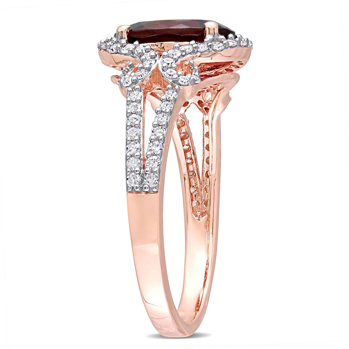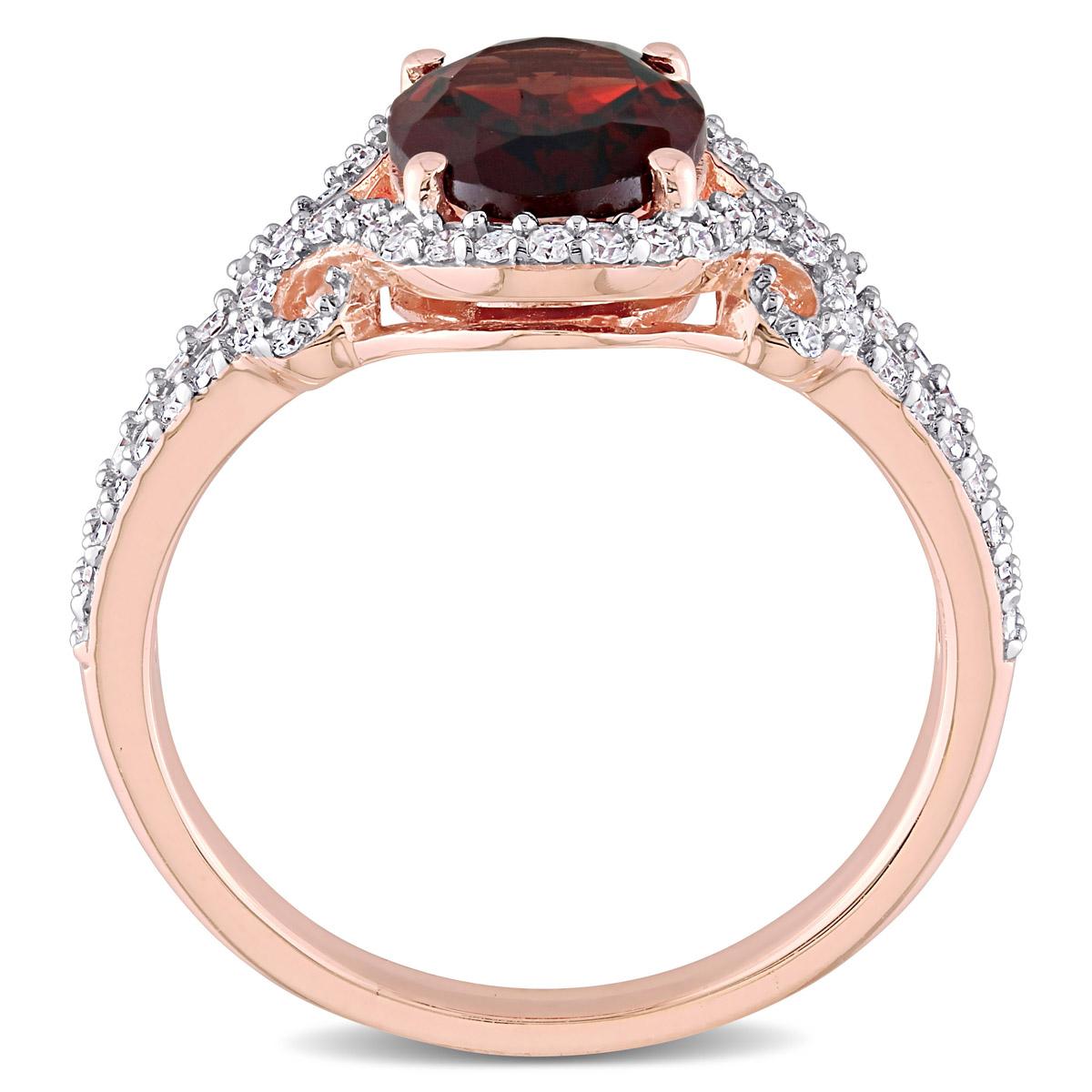 Description This modern Gemstone Classics™ halo engagement ring is crafted in 10kt. rose gold and features an oval-cut, prong-set garnet at the center encrusted by a halo of 70...