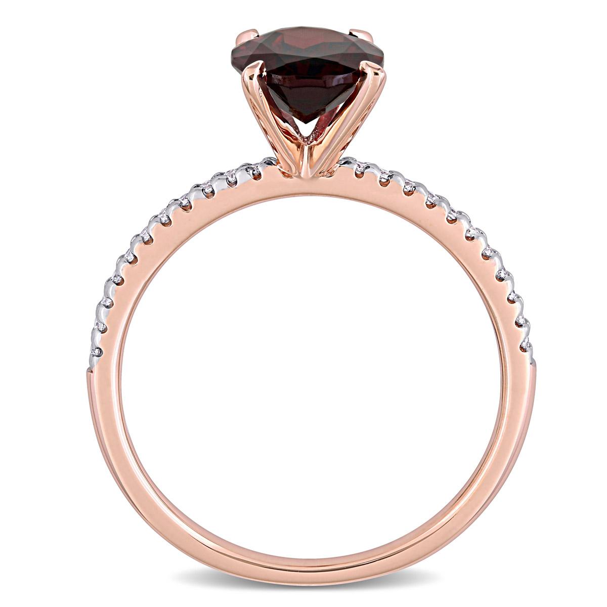 This modern Gemstone Classics™ solitaire engagement ring is crafted in 14kt. rose gold. This gorgeous wedding ring features an oval-cut garnet at the center surrounded by 22 round-cut shimmering white diamonds set on the shank. A pretty ring design that you can keep close to your heart for a lifetime. Celebrate your style and look with this flattering gemstone and diamond ring.