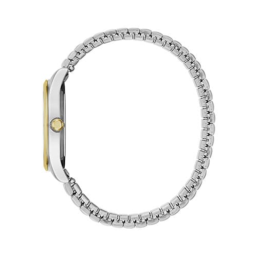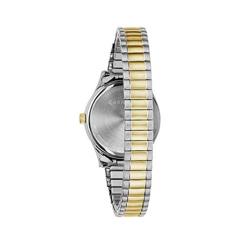 This Womens Caravelle two-tone expansion bracelet watch offers a timeless design that you can wear with everything. It features easy to read numerals with a 24-hour design, and a three hand date feature. The gold-tone accents on the stainless steel case and comfort-fit expansion bracelet are the finishing touches on this classic watch. Wipe with a clean cloth. Case Dimensions: 30mm x 7mm.Style 45M111.Limited Manufacturer´s Warranty.