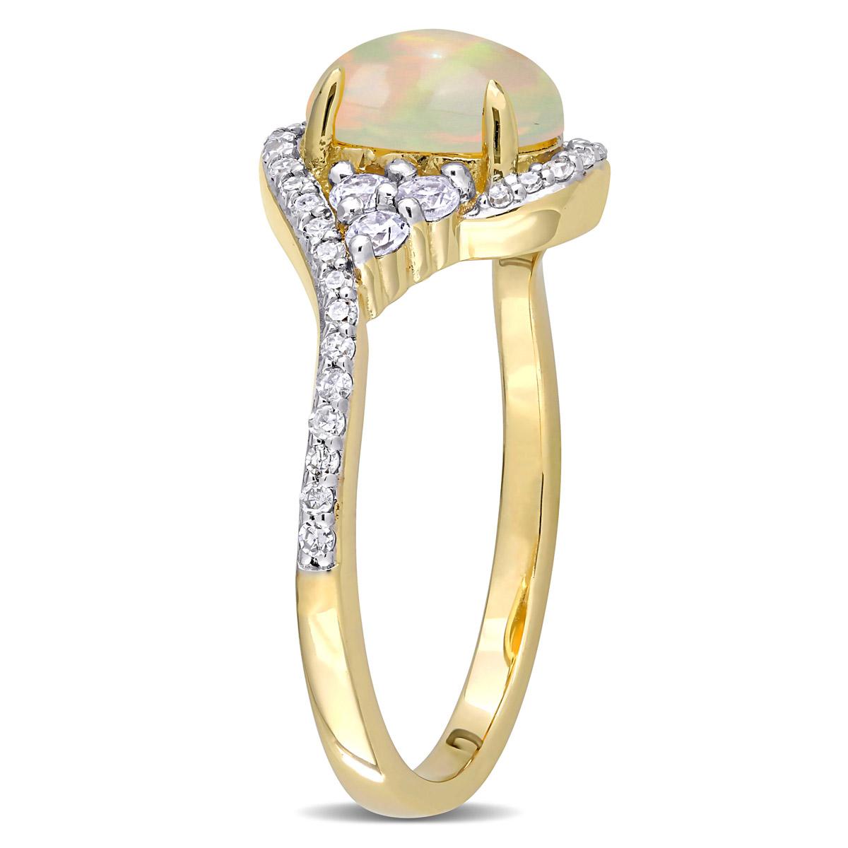 Description This vintage-inspired Gemstone Classics™ opal, white sapphire, and diamond bypass ring is crafted in luminous 10kt. yellow gold and features an oval cabochon-cut,...