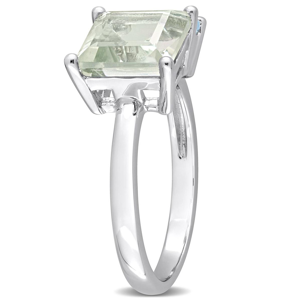 Raise your glam quotient with this colorful Gemstone Classics™ octagon green quartz and sky blue topaz 2-stone ring. Crafted in lustrous sterling silver, this vibrant ring showcases one octagon-cut prong-set green quartz and one round prong-set sky blue topaz studded elegantly on a sleek band. Enhanced with a brilliant finish, this beautiful ring is the perfect accessory for a summer look.