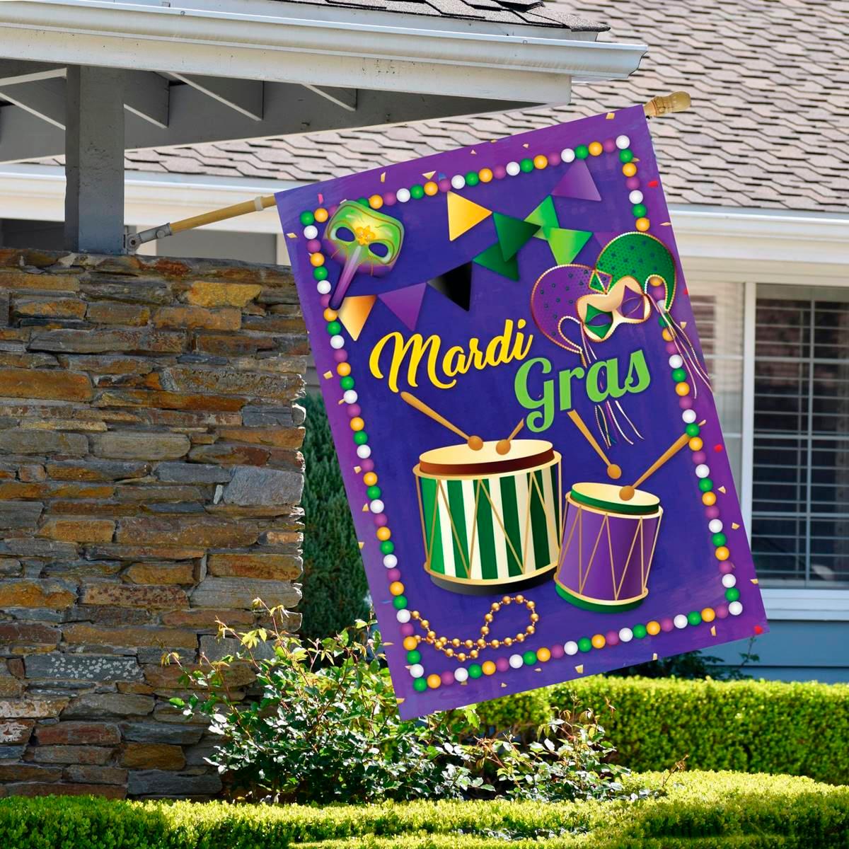 Celebrate this fun-filled holiday with a Northlight Seasonal Mardi Gras flag! Features drums masks beads and vibrant colors of green purple yellow and white. Add this flag to your home to bring a vibrant look to your Mardi Gras party or Fat Tuesday celebration.This item requires oversize delivery. Please refer to the Order Summary in the Shipping step at checkout for delivery charge.