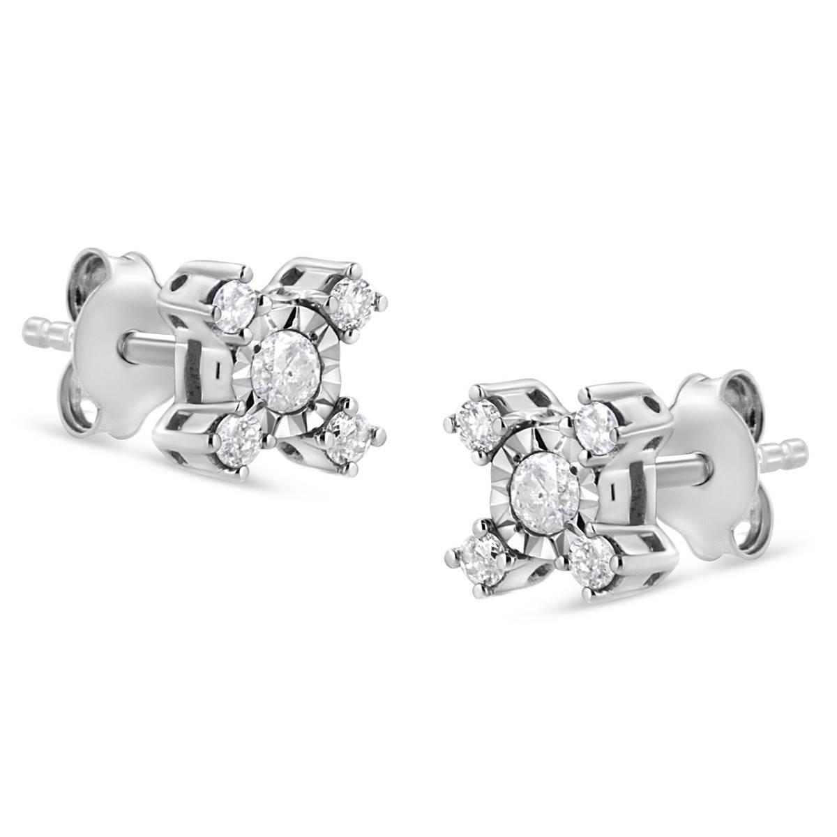 These Haus of Brilliance earrings are a unique twist on the classic everyday studs. A sparkling round-cut diamond is set in a miracle setting at the center of this piece, and four princess-cut diamonds frame the central motif creating a stunning "X" shape. Set in cool .925 sterling silver, this piece has a total diamond weight of 1/4ctw.