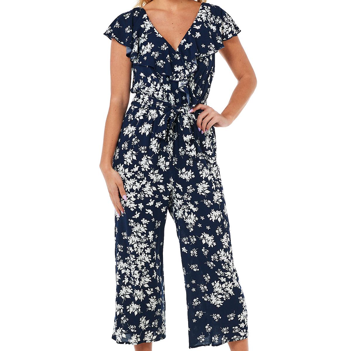 Description Update your style with this Womens Luxology floral print challis jumpsuit. Sleeve Length: Short SleeveNeck: V-NeckTie waistRuffle front Tie Front Inseam: 22 " Care:...