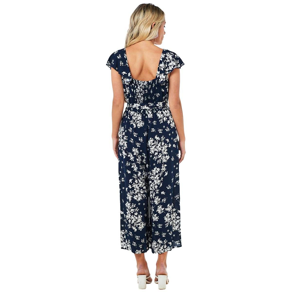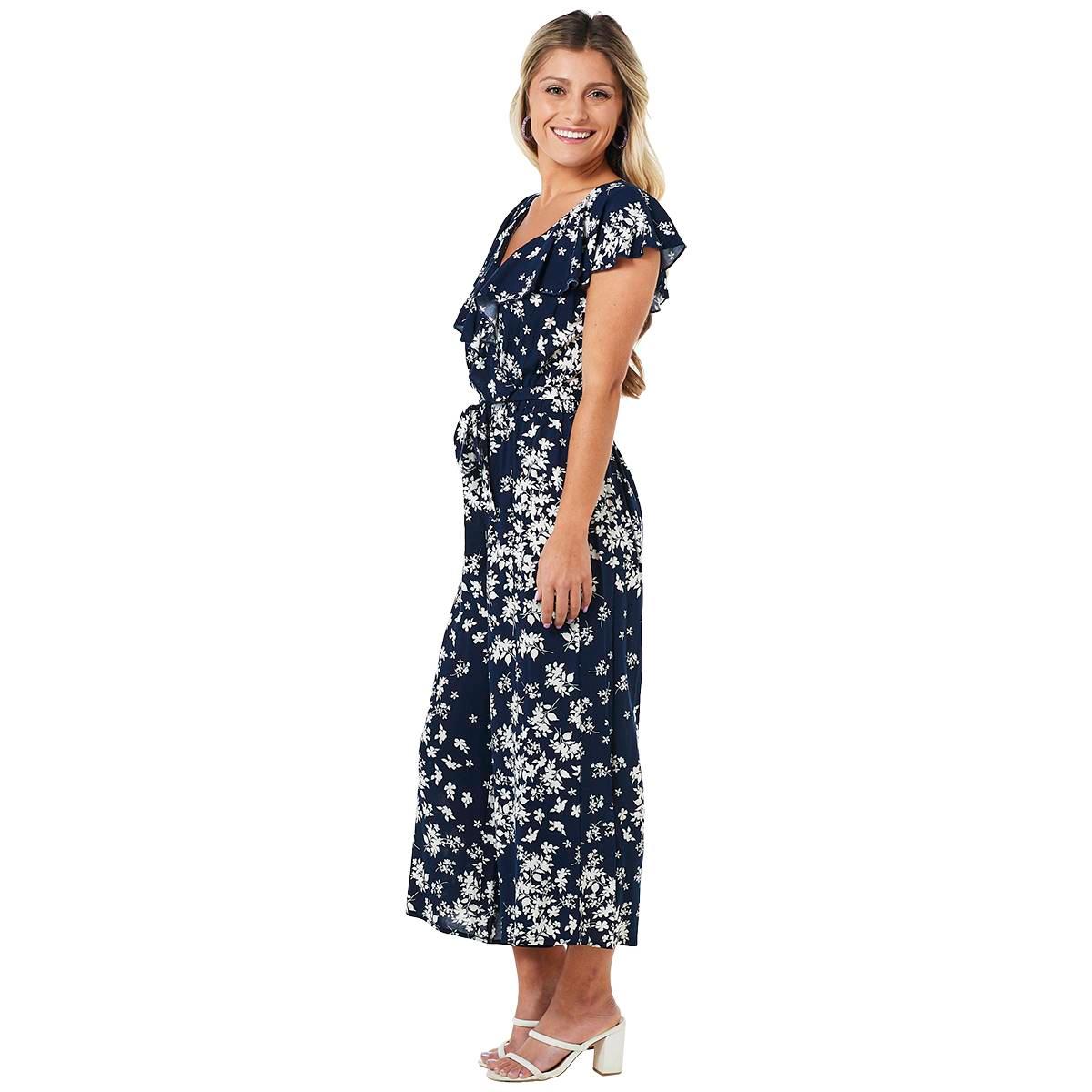 Womens Luxology Short Ruffle Sleeve Challis Jumpsuit-Navy/Ivory
