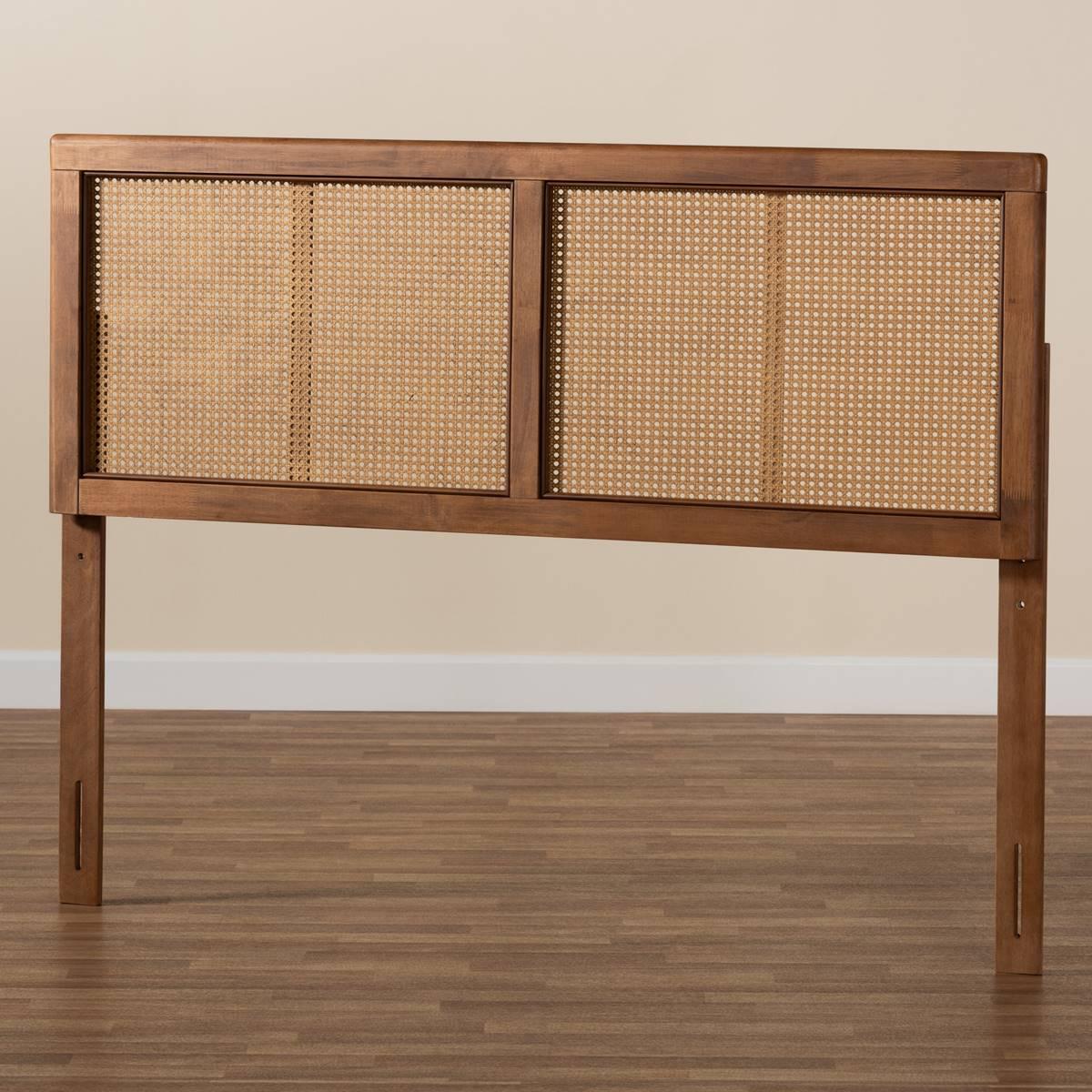 Add a vintage accent to your bedroom with this Baxton Studio Gilbert headboard. Made in Malaysia, the frame of the Gilbert is comprised of sturdy wood showcasing a natural ash walnut finish. Woven synthetic rattan is embedded within the wood for an airy, mid-century look. Requiring assembly, the headboard is supported by sturdy wood legs that feature six pre-drilled holes for easy height customization. Providing superb back support when sitting up in bed, the Gilbert headboard enhances any bedroom.