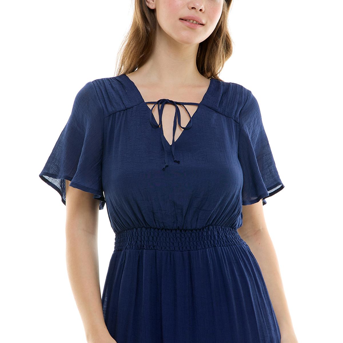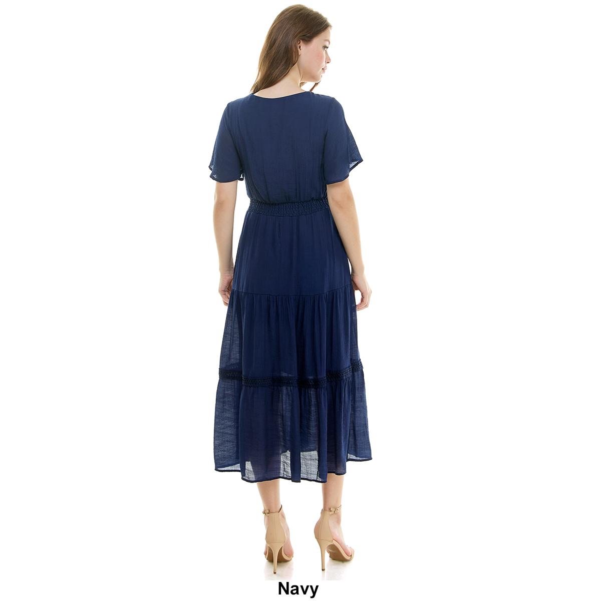Description Put this Womens Luxology solid gauze tier hem midi dress on for a nice breeze on a summer day. Sleeve Length: Short SleeveNeck: V-NeckLength: 58"Tie neckFlutter...