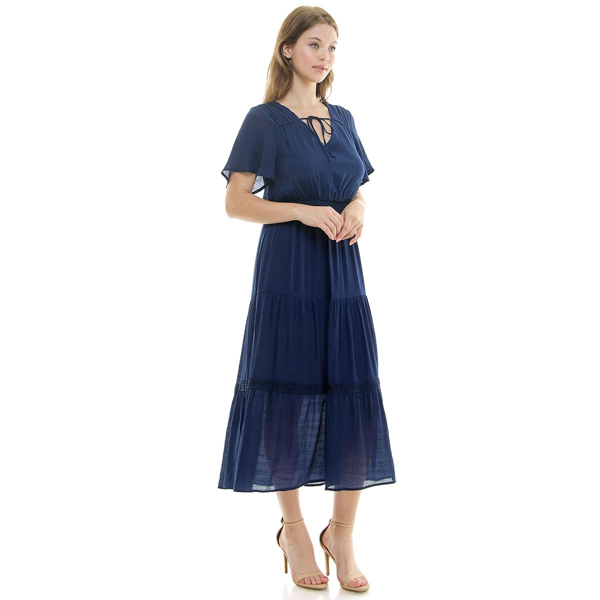 Womens Luxology Short Sleeve Tie Neck Gauze Tier Hem Midi Dress