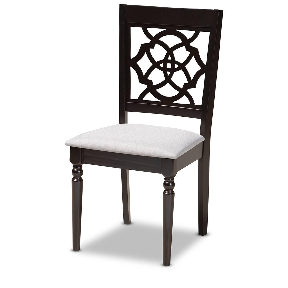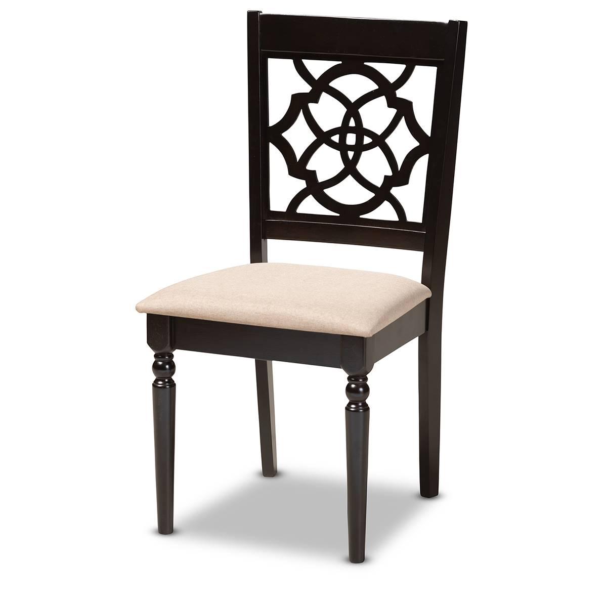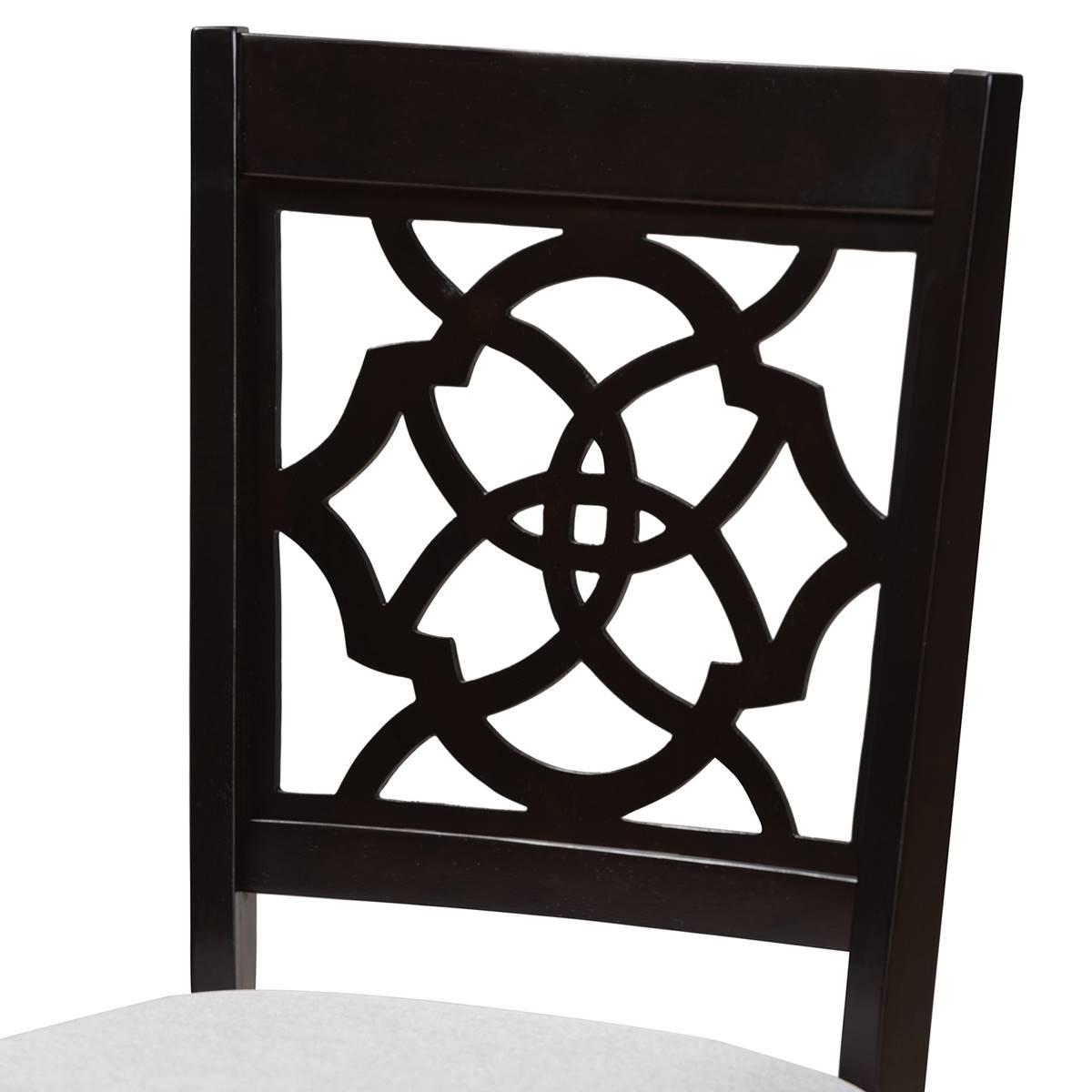 This Baxton Studio set of 4 Renaud wooden dining chairs are quality craftsmanship. Constructed from solid oak wood, the Renaud showcases a rich espresso brown finish that complements the light polyester fabric upholstery. Designed with both comfort and style in mind, the Renaud features a plush foam padded seat, as well as an exquisite cut out design on its back. Turned legs add a classic, refined touch.