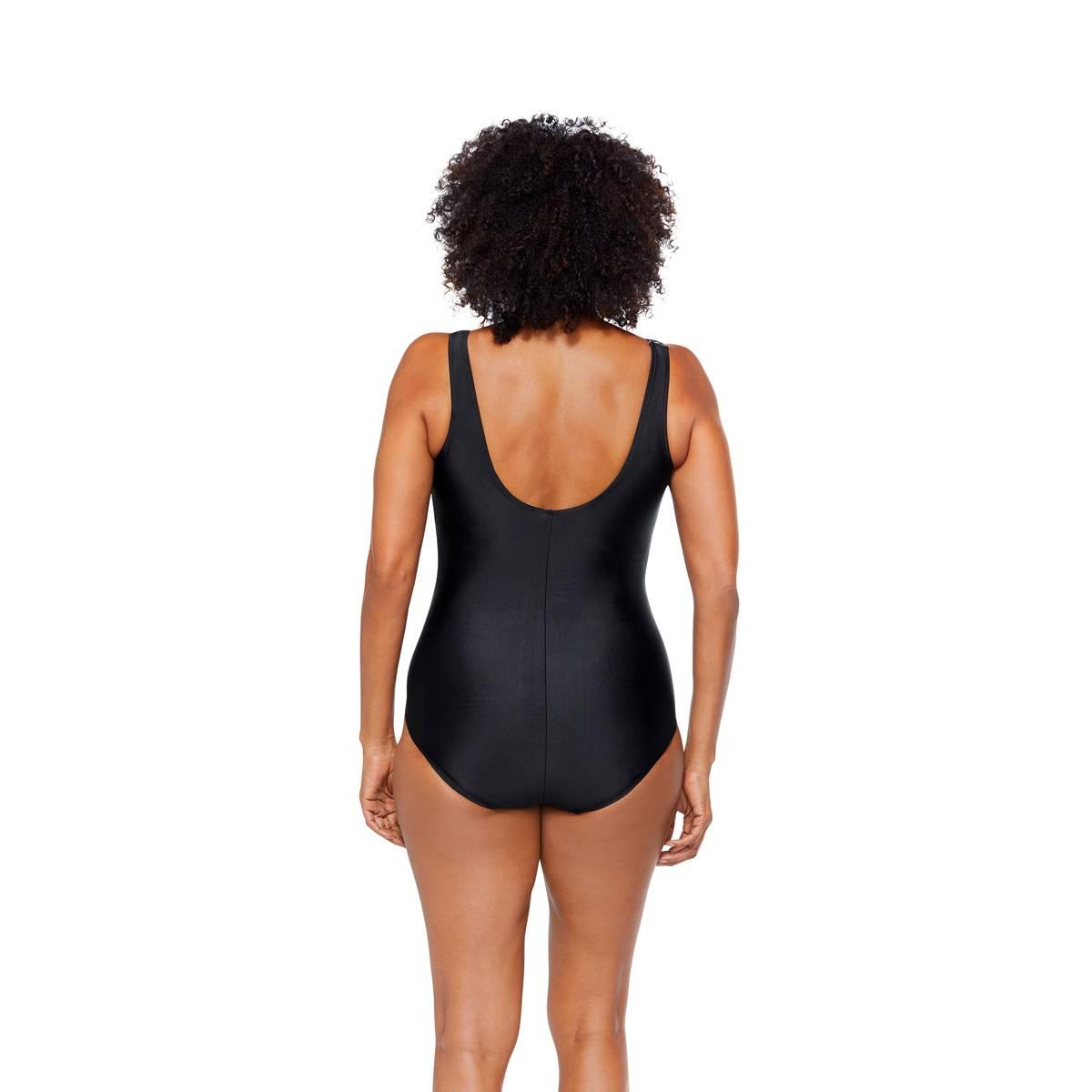 Add color to your swim style with this Womens Reebok shallow end sporty zipper one piece swimsuit.