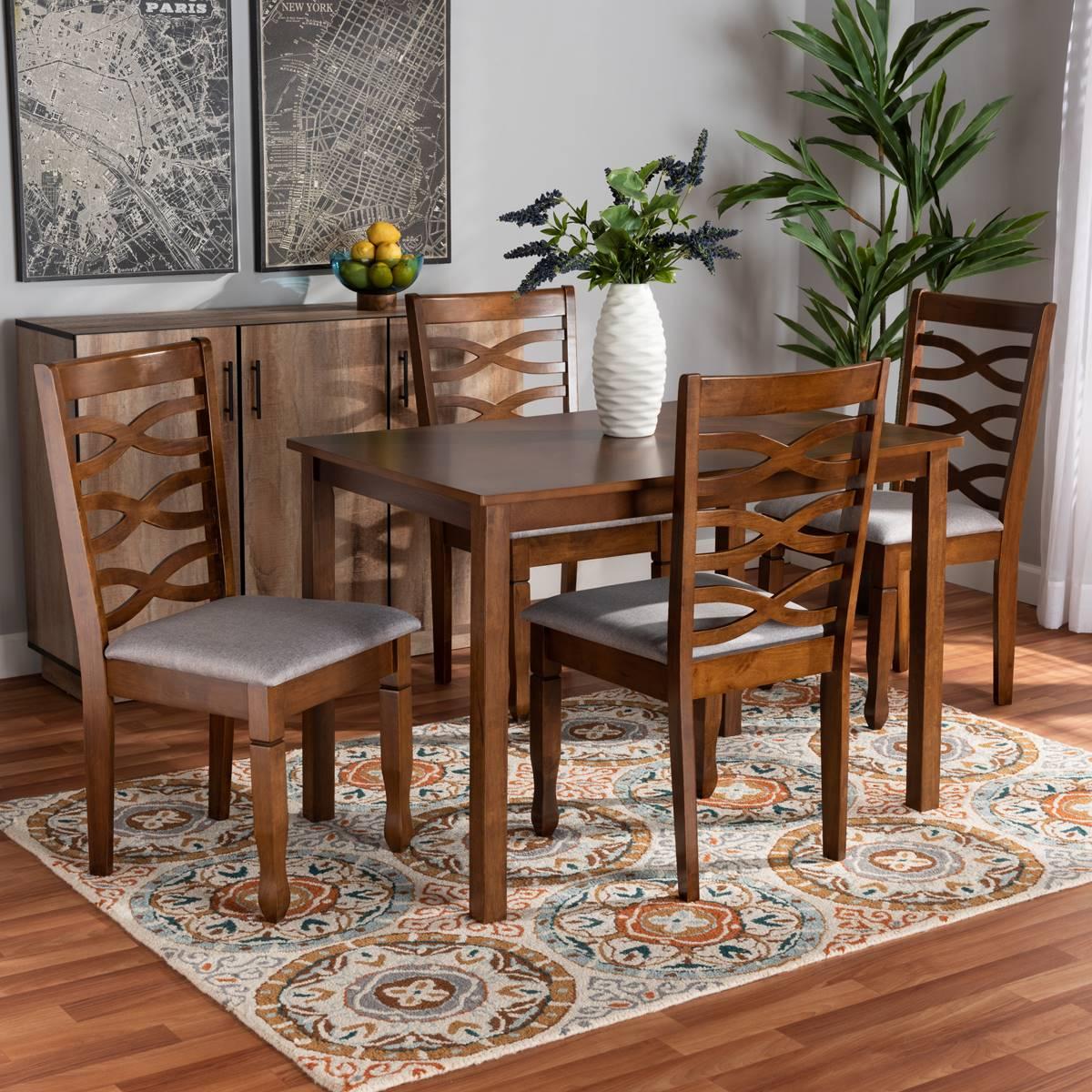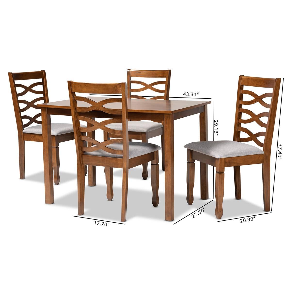Elegant yet comfortable, the Baxton Studio Lanier dining set is a timeless addition to any space. Made in Malaysia, the set includes four dining chairs and one table constructed from sturdy wood in a walnut brown finish. The chairs are upholstered in a grey fabric that complements the warm wood finish on the frame. Designed with both comfort and style in mind, each chair features a plush foam-padded seat as well as a striking cut-out design on its back. Tapered feet add a classic, refined touch. Requiring assembly, the large, rectangular tabletop ensures plenty of elbow room for each member of the table. Equally enjoyable for both dinner parties and family dinners, the Lanier dining set is sure to enhance any dining experience.