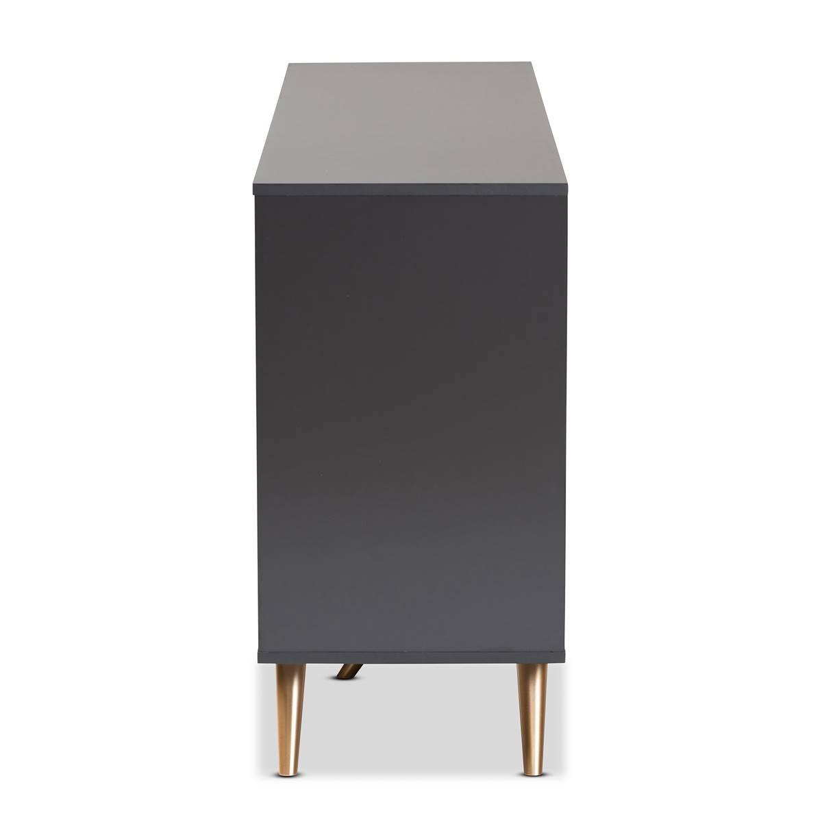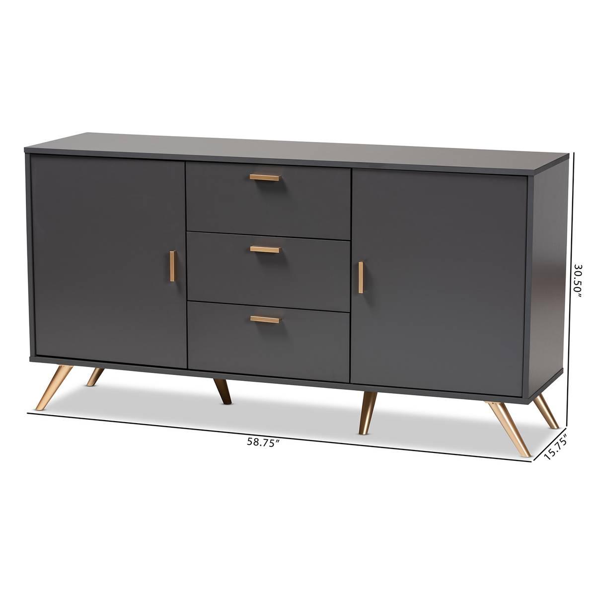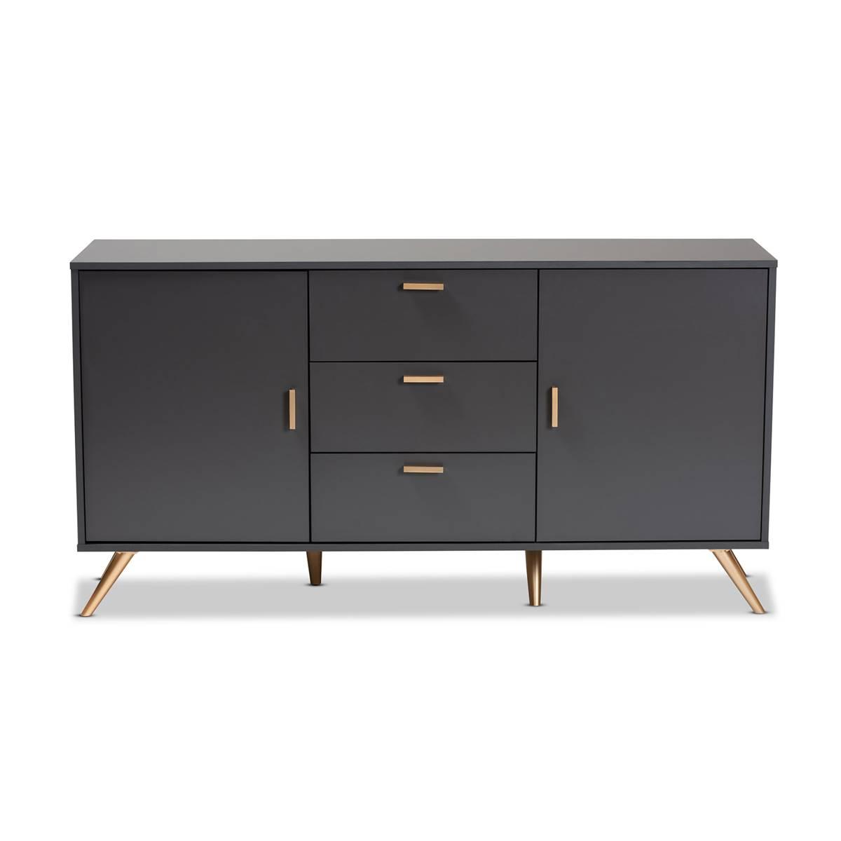 A tasteful expression of modern minimalism, the Baxton Studio Kelson buffet is an impressive solution to dining storage. Made in Malaysia, the sturdy wood frame of the Kelson showcases a dark grey finish that exudes a cool, contemporary character. Three spacious drawers easily organize utensils, while four shelves behind the doors support larger cookware. Requiring assembly, the Kelson utilizes gold-tone angled legs for stable support with a luxurious touch. Gold handles add an eye-catching touch, making the Kelson buffet a refreshing addition to any space.