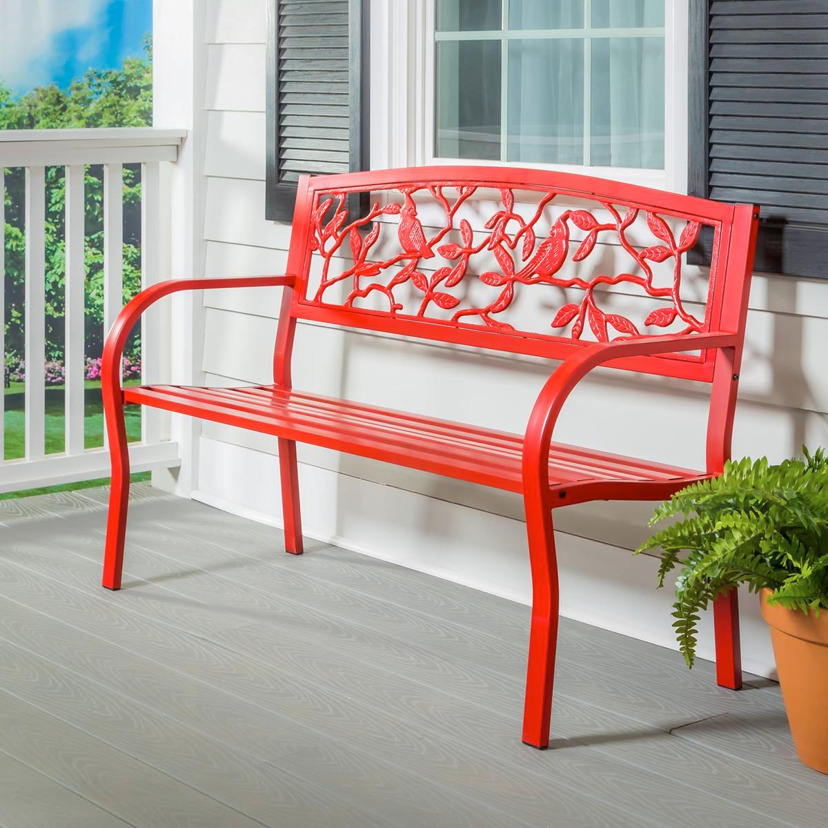 With its cast-iron cardinals and branches, this all-weather Evergreen garden bench is a charming addition to any garden. The bright red finish with brushed highlights lends a bold look to this steel frame design. Featuring a slatted seat, curved arms, and an arched back, the bench adds a contemporary touch to outdoor spaces. Crafted from durable metal, the bench is outdoors safe and rust-resistant to ensure it endures against the elements.