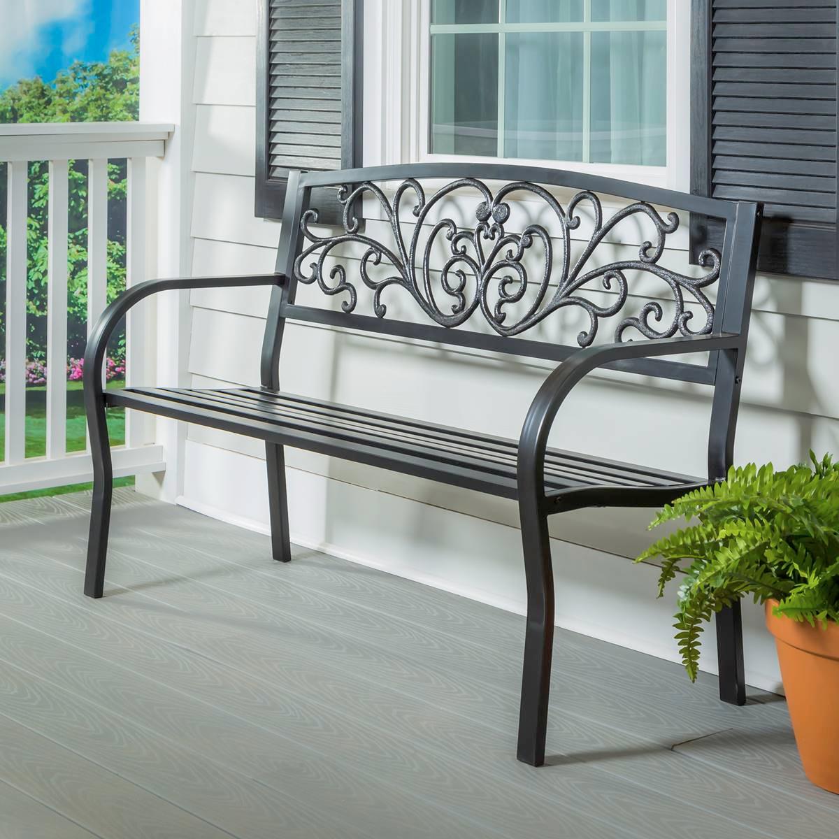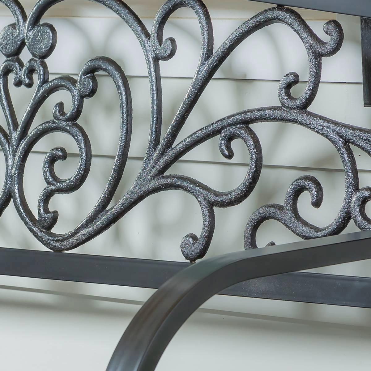 With its cast-iron scroll design, this all-weather Evergreen garden bench is a charming addition to any garden. The classic black finish with brushed highlights lends a timeless look to this steel frame design. Featuring a slatted seat, curved arms, and an arched back, the bench adds a contemporary touch to outdoor spaces. Crafted from durable metal, the bench is outdoors safe and rust-resistant to ensure it endures against the elements.