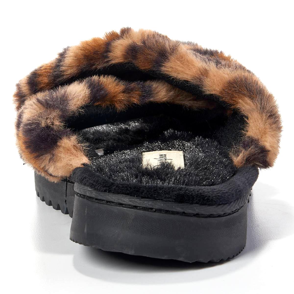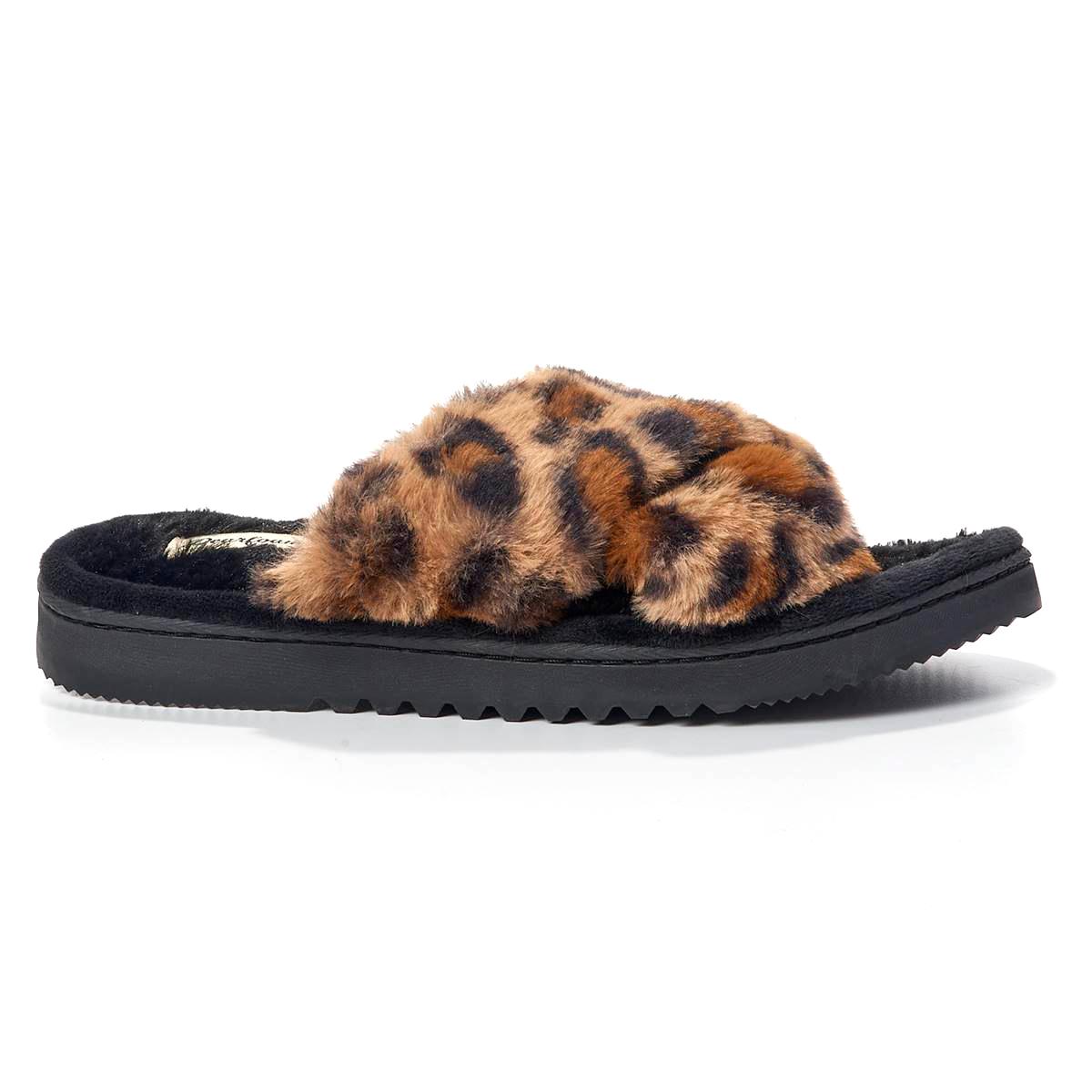 Description These Womens Dearfoams® Miranda leoard pile x-band slides slippers offers an extra cushy memory foam insoles are sure to be a treat for your feet after busy days and...