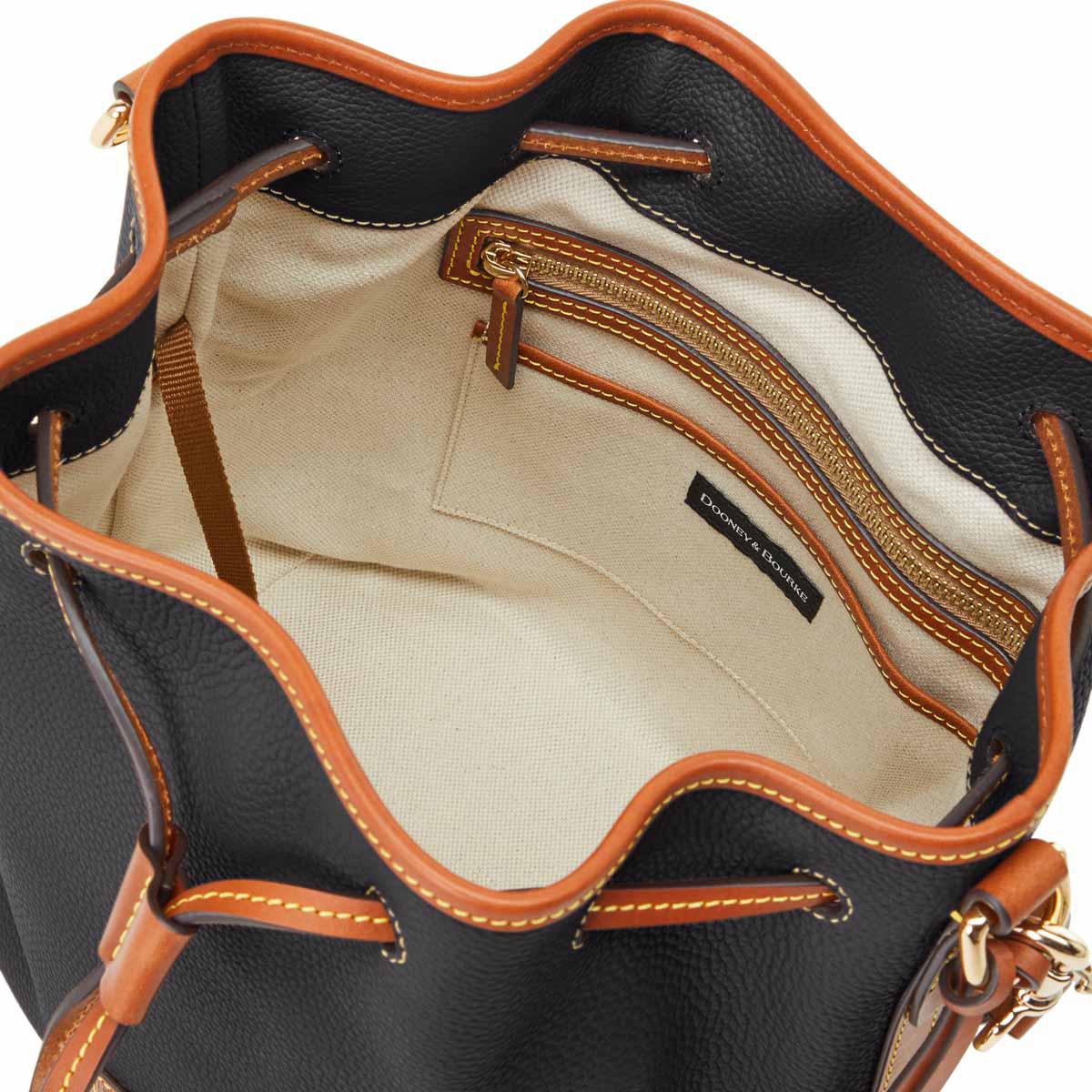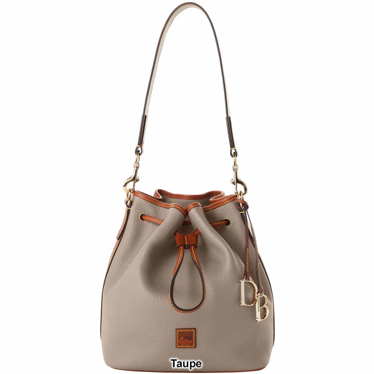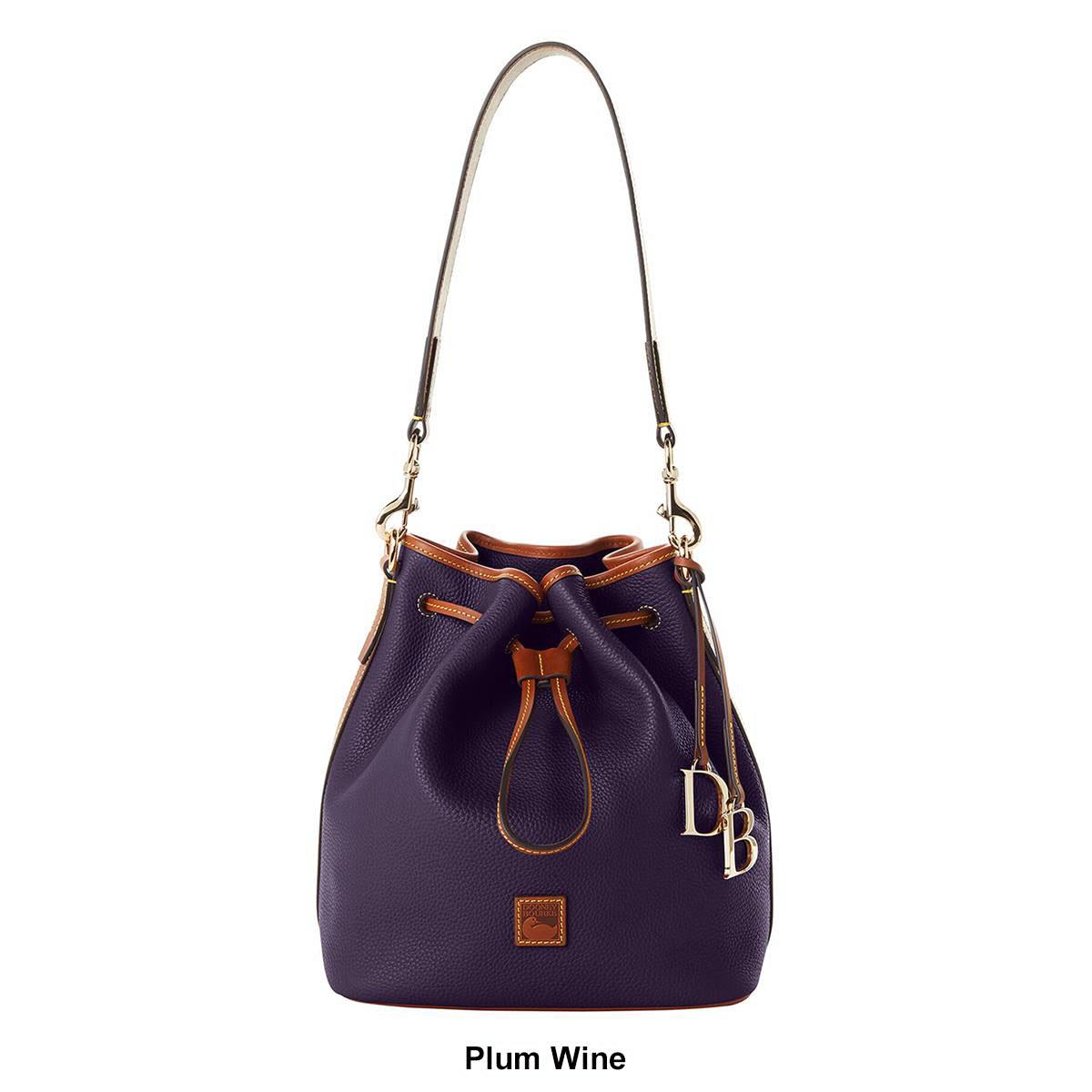 Description This iconic Dooney & Bourke pebble grain drawstring is accented with Vacchetta pebbled leather details like the adjustable drawstring closure, embossed logo, and...