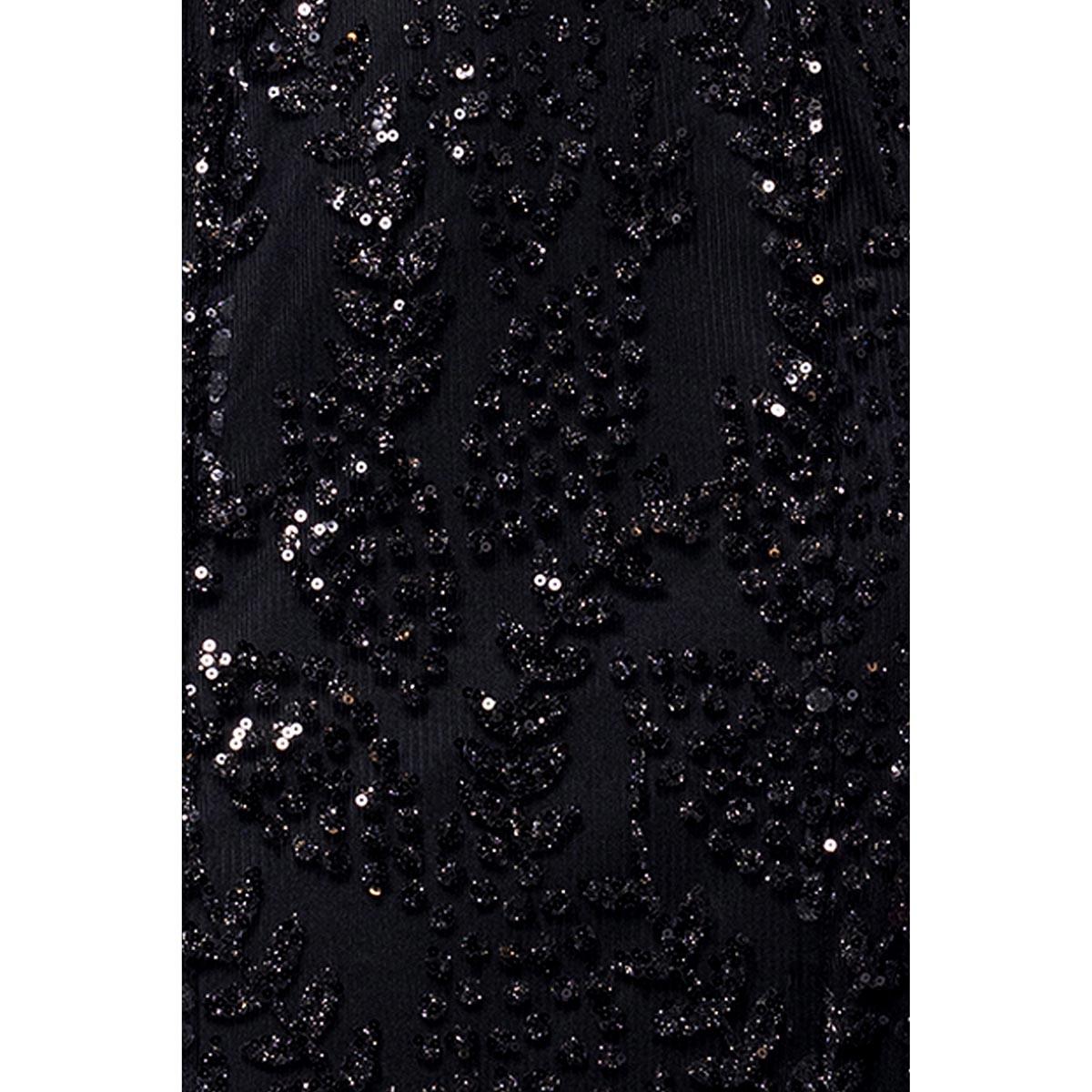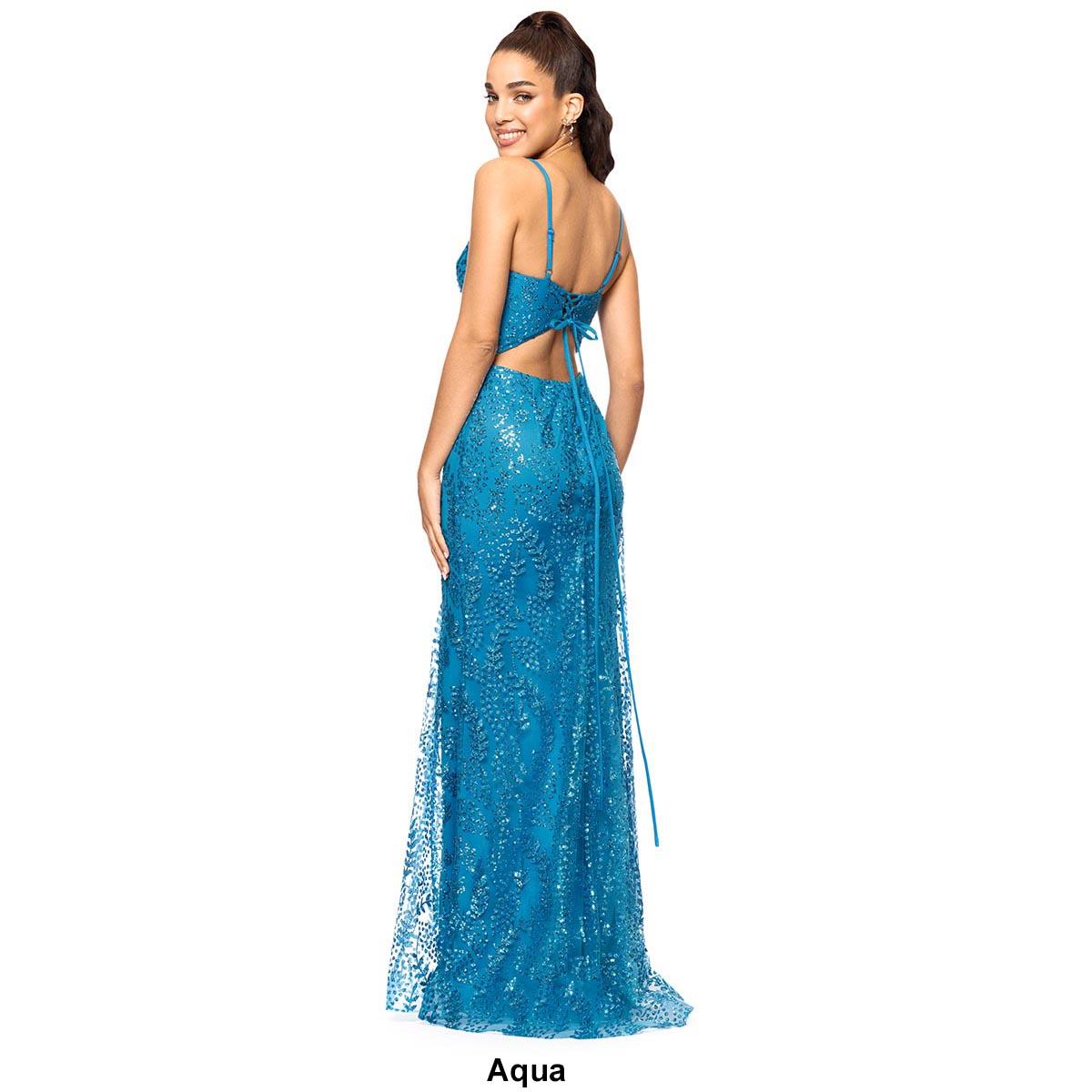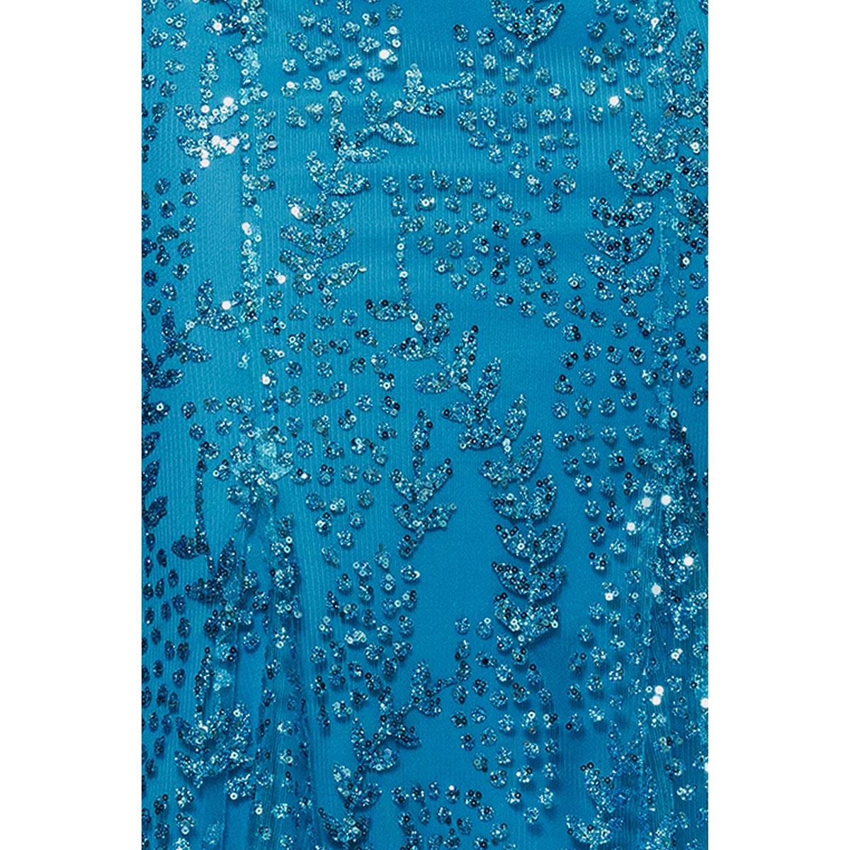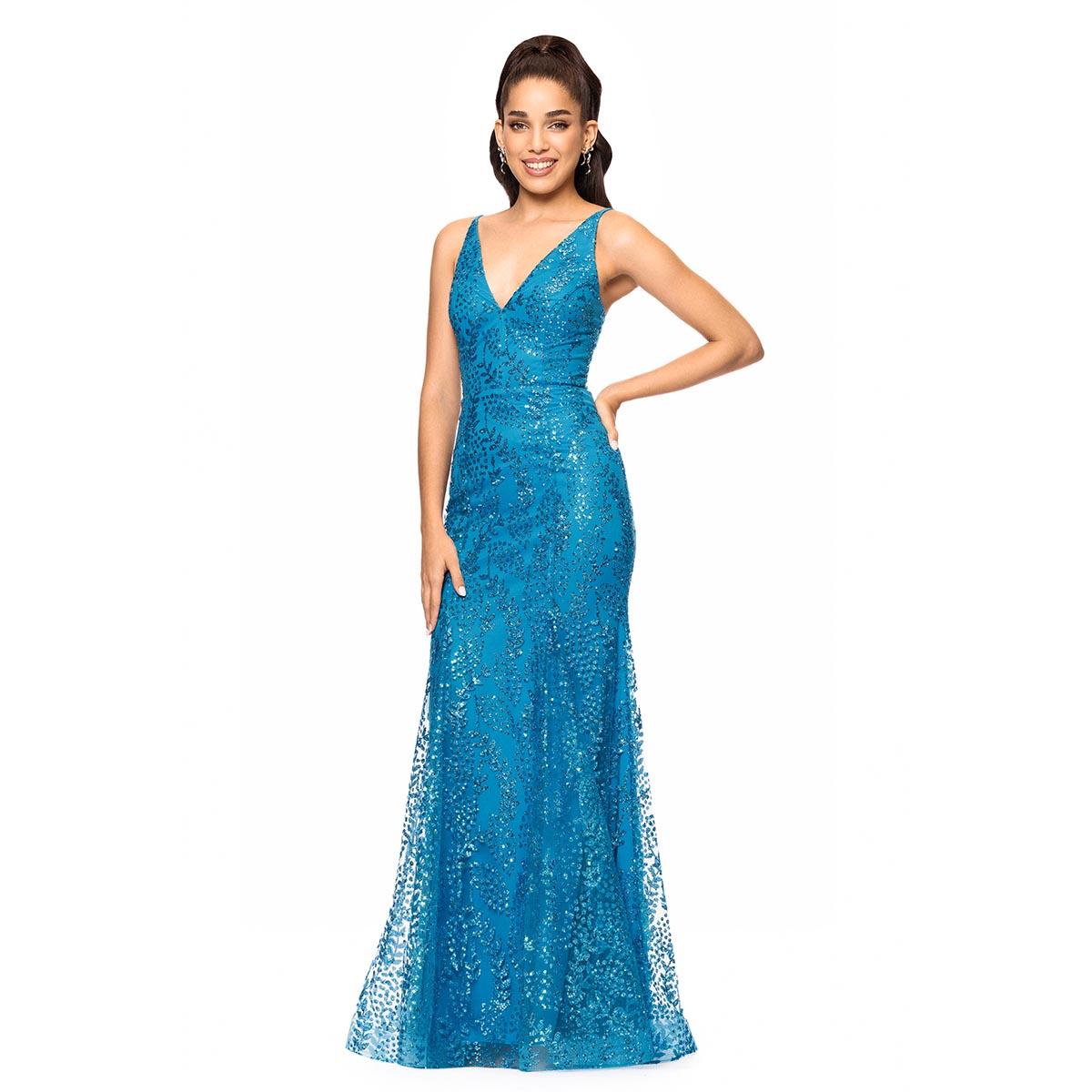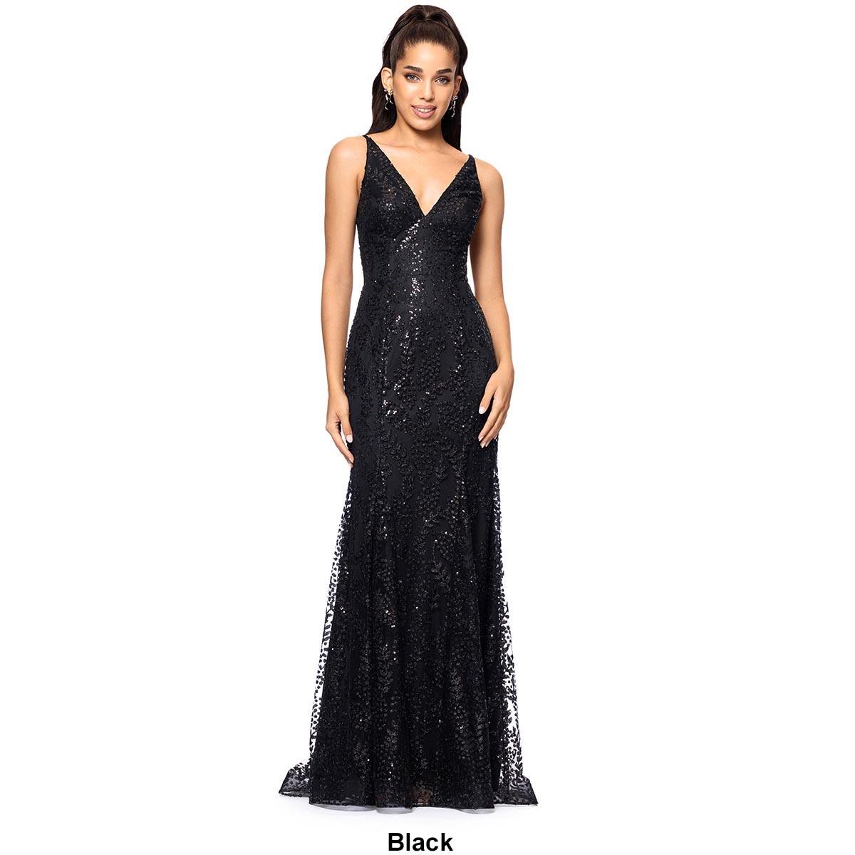 Description Length: Approx. 60"Sleeve Length: SleevelessNeck: V-NeckAllover glittered mesh detailOpen back detailLace up tie backHidden back zipperSewn-in lining Care: Spot Clean...